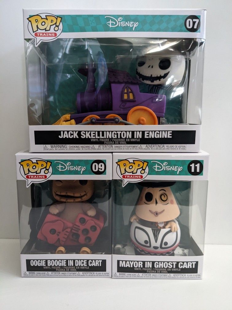 Nightmare Before Christmas Funko Pop Train Set Bundle. Includes Jack Skellington in Engine Train Cart, Oogie Boogie in Dice Cart and Mayor. Checkout my other listings. Tons of pops for sale.