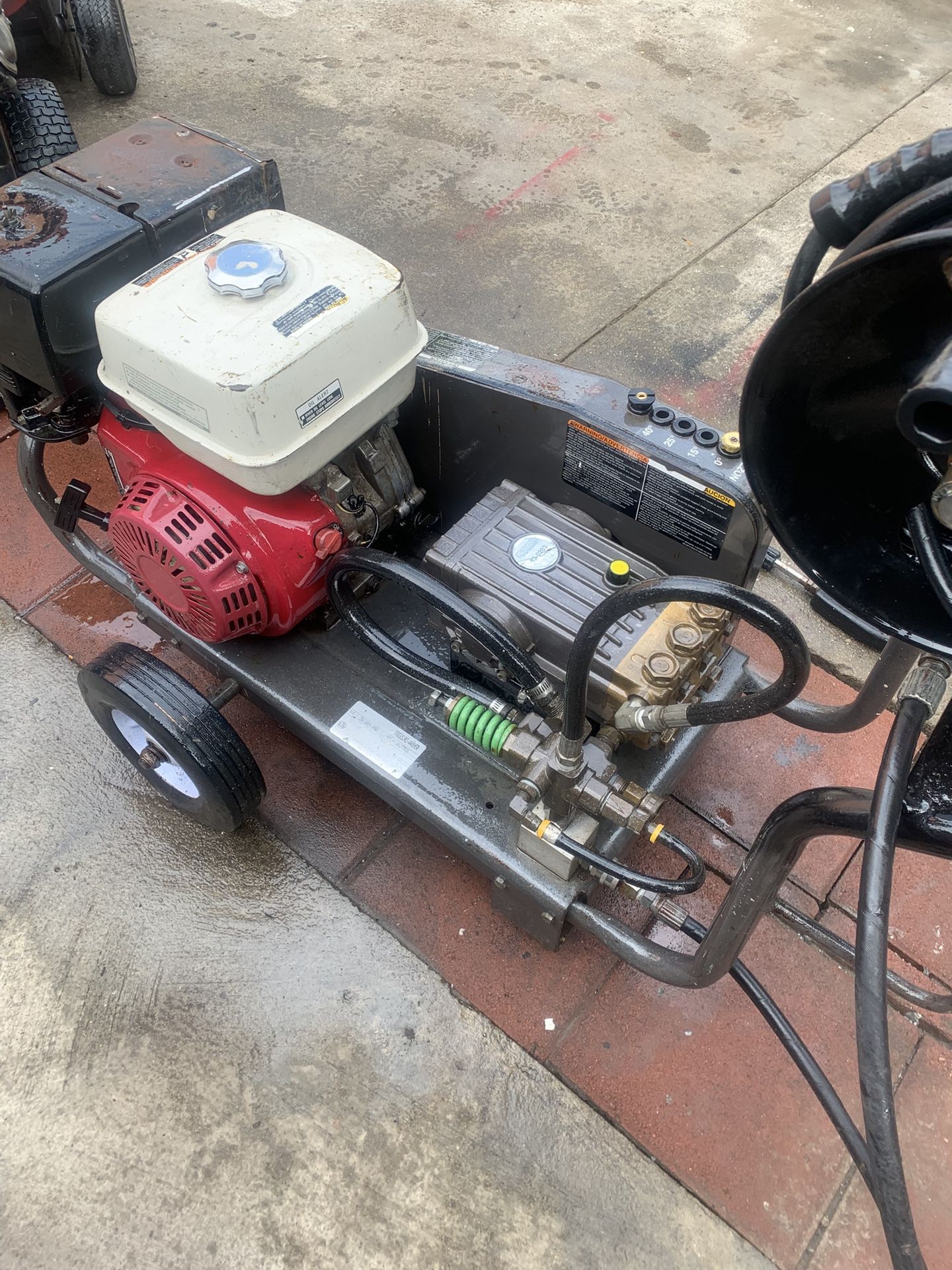 3500 psi…4 gpm…. Works perfect…. Strong… comes complete with hose and reel and gun