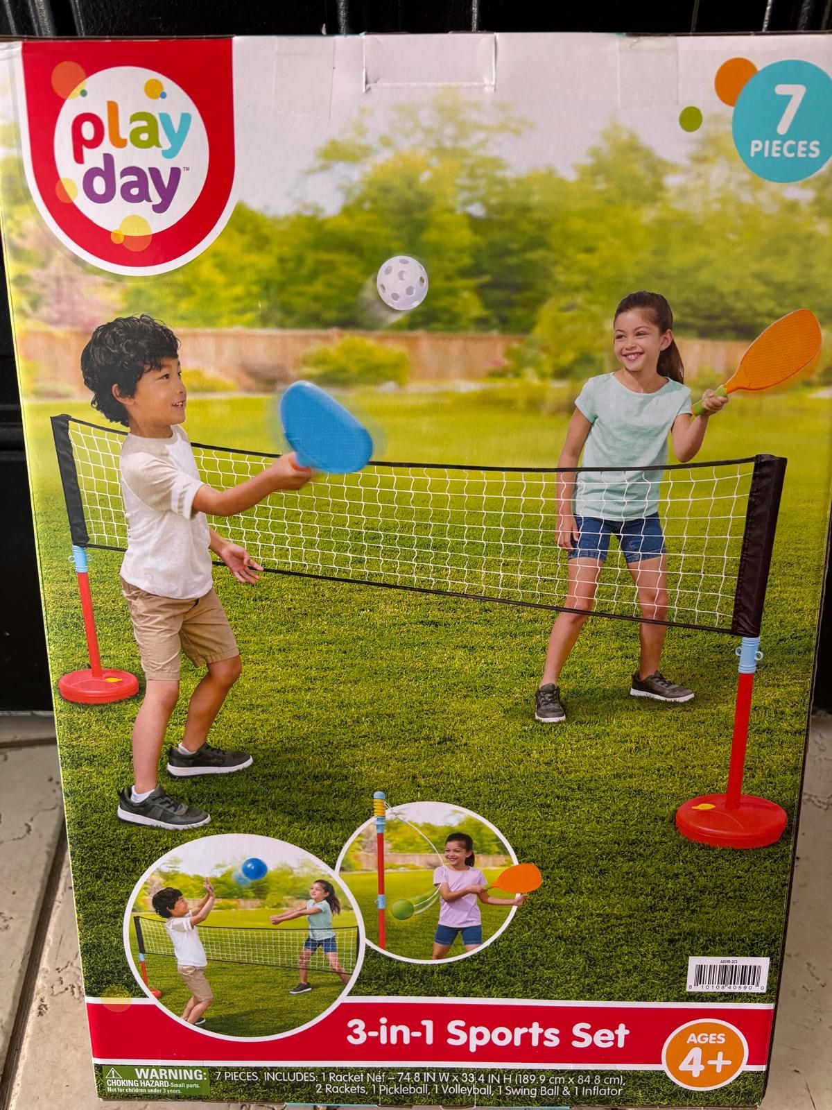 Deluxe net game set - Net 74.8" W X 33.4" H Perfect for racket ball, volleyball, and more Play Day 3-In-1 Game Set includes 1 racket net, 2 rackets, 1 pickleball, 1 volleyball, 1 swing ball and 1 inflator Easy to assemble Great for outdoor use Fun for all ages: preschool, children, Ages 3+