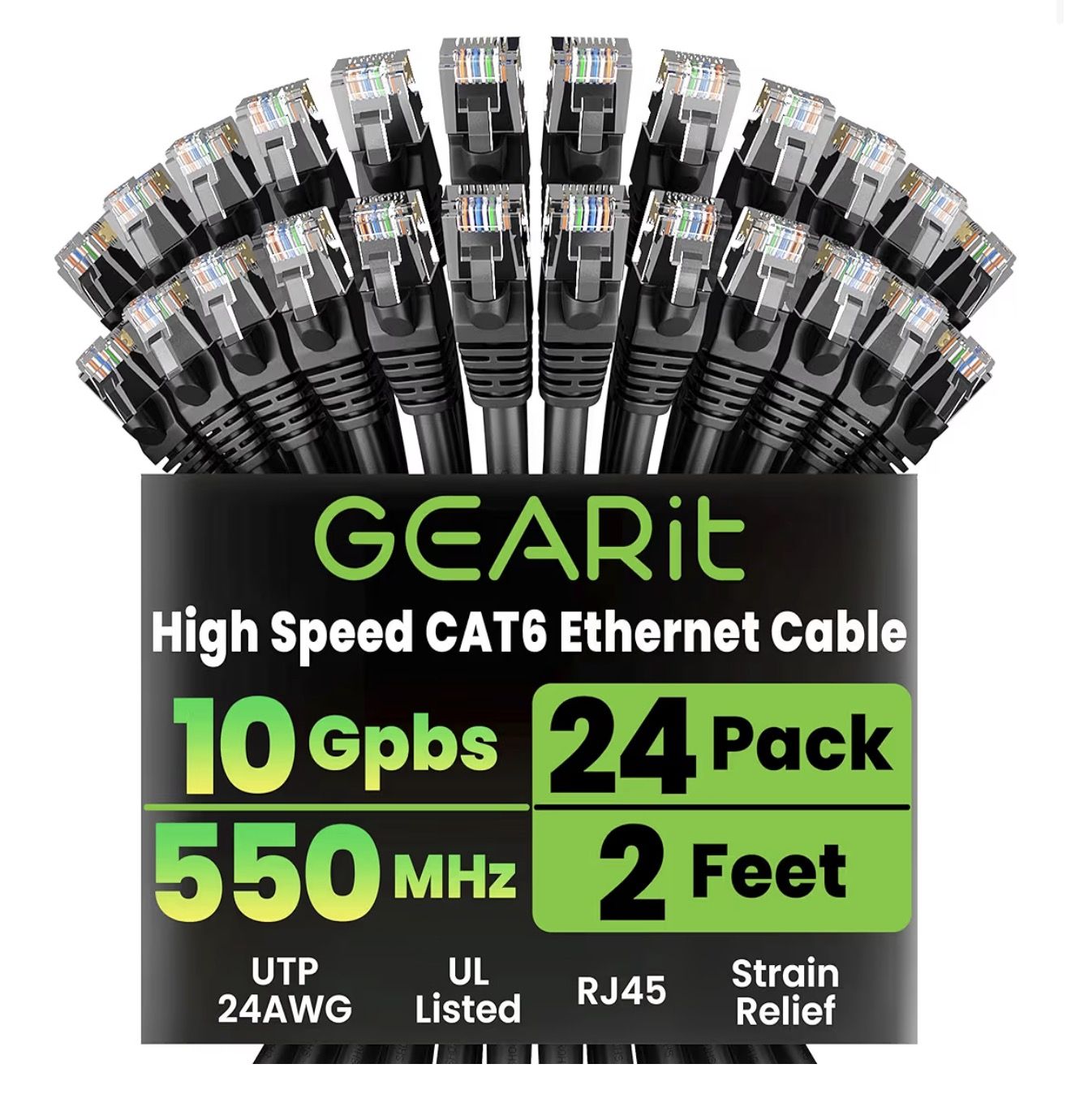 GEARit Cat 6 Ethernet Cable Pack - 24-Pack 2 ft Cat6 Ethernet Patch Cables | RJ45 Network Patch Cable, 10 Gbps Snagless Gold-Plated Connectors - Ethernet Cable Cat 6 for PC, TV, Router - Black. Cable Ethernet GEARit Cat 6 (paquete de 24) - Cables de conexión Ethernet Cat 6 de 60 cm | Cable de conexión de red RJ45, conectores chapados en oro de 10 Gbps sin enganches - Cable Ethernet Cat 6 para PC, TV y router - Negro