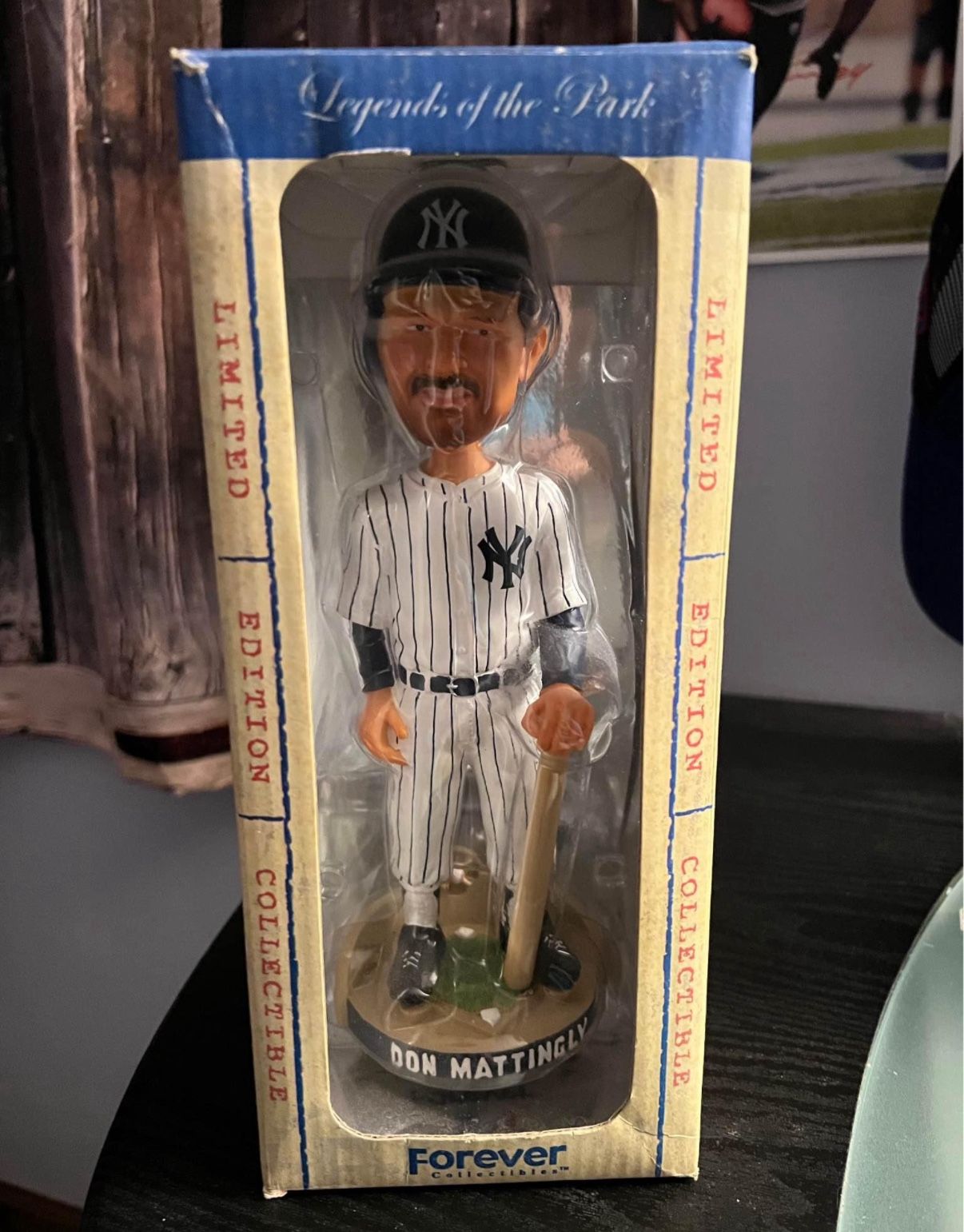 Don Mattingly Mr. Baseball was a fan favorite for the New York Yankees this is a 9.5 inch forever bobblehead called legends of the Diamond it feature Mattingly in his Yankees pinstripes in it original box it is limited edition figure