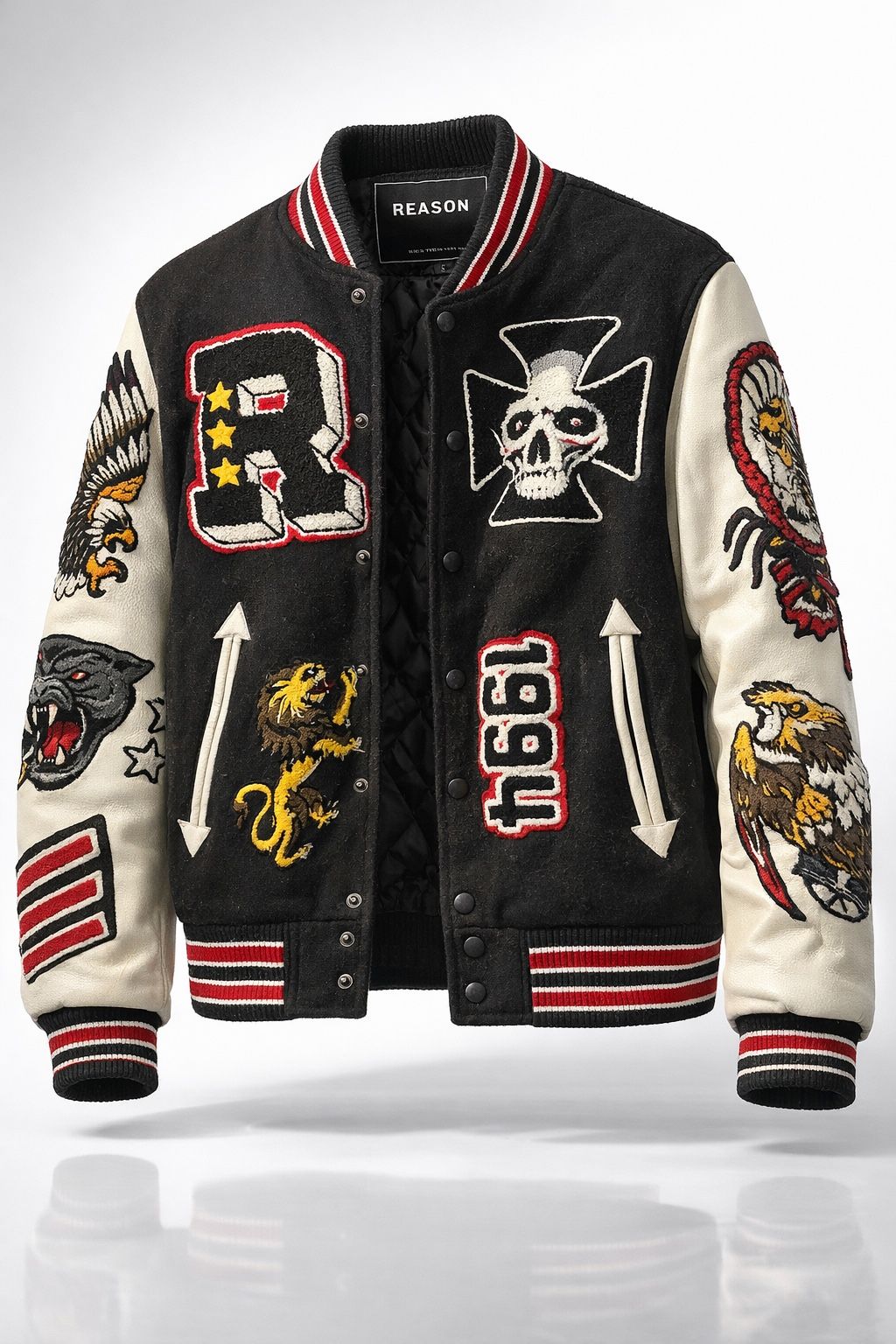 ✨ Reason NYC Varsity Jacket 📍 Talla: S 🖤 Estilo varsity / streetwear con parches bordados grandes (calavera, águilas, letra “R”, etc.) 👕 Cuerpo de tipo lana con mangas en contraste y forro acolchado 📌 Botones a presión, diseño único y llamativo Condición: Usada, con desgaste normal de uso (puede tener pelusa en algunas zonas, ver fotos).