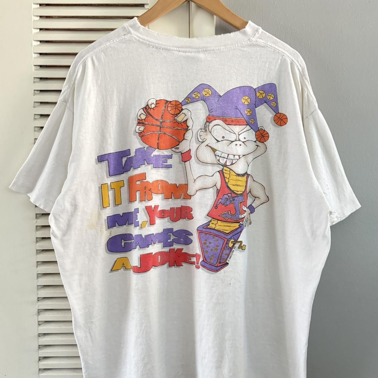 Vintage 90’s Distressed CYRK Basketball Trash Talk T-shirt Single Stitch. Super cool large front and back print. Funny Humorous basketball trash talk print on the front and back ‘Take It From Me, Your Games A Joke’. Perfectly distressed with holes and stains throughout which add more character to that vintage distressed look Size XL (SEE ACTUAL MEASUREMENTS) Actual measurements Pit to pit: 25” Length: 27.5” Message for measurements or any other questions #vintage #grunge #Sports #Basketball #chic