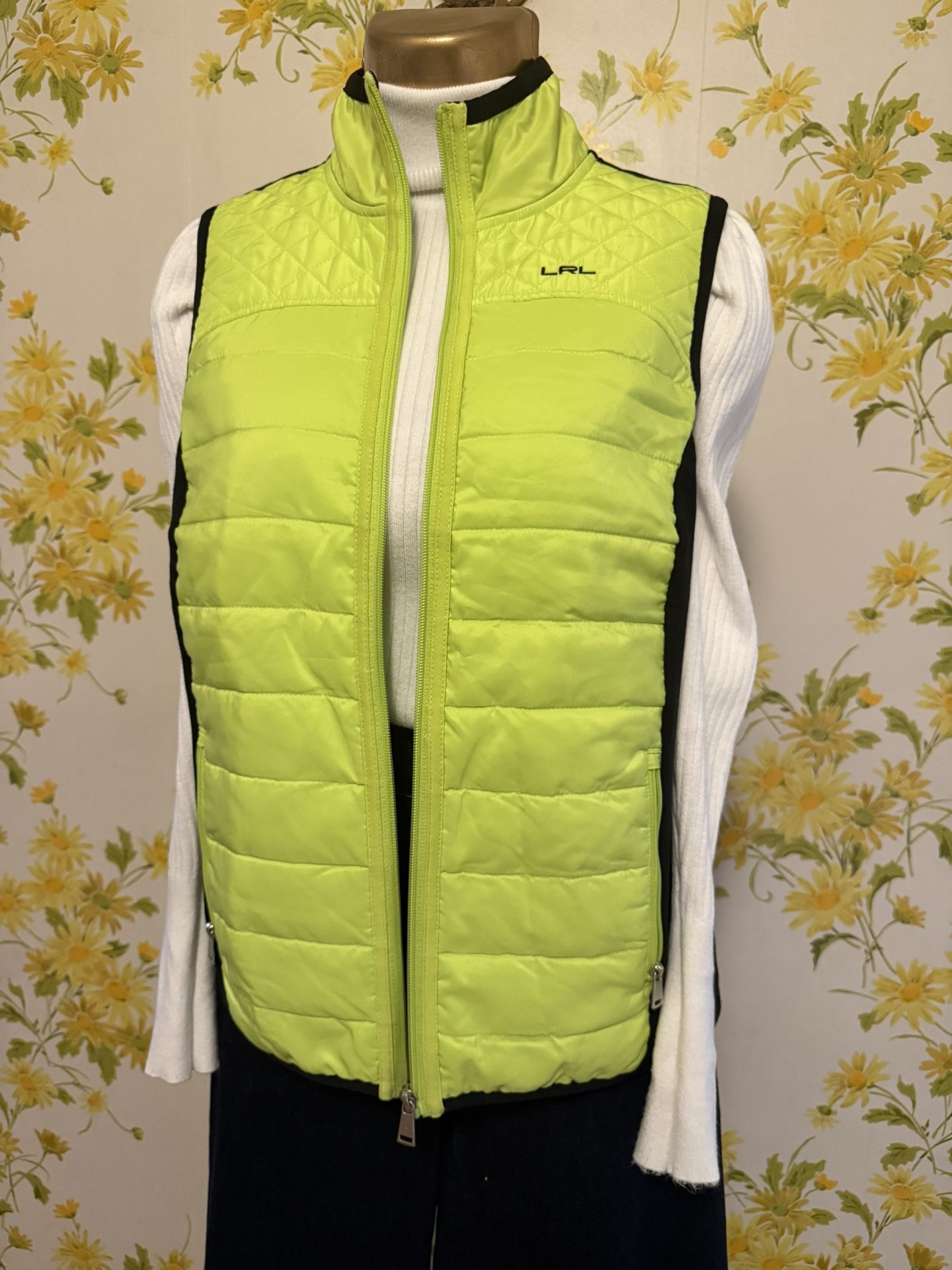 Lauren by Ralph Lauren neon and Black LIGHTWEIGHT puffer vest, front zíper closure, convenient zippered side pockets. And interior pockets, knit body on back; 68% cotton, 26% polyester, 6% elastane woven body; 100% polyester, lining: 100% polyester, color may vary by device screen and light, the green color is NOT that bright. Zoom and review each photo to see details and measurements. Very good conditions, no rips