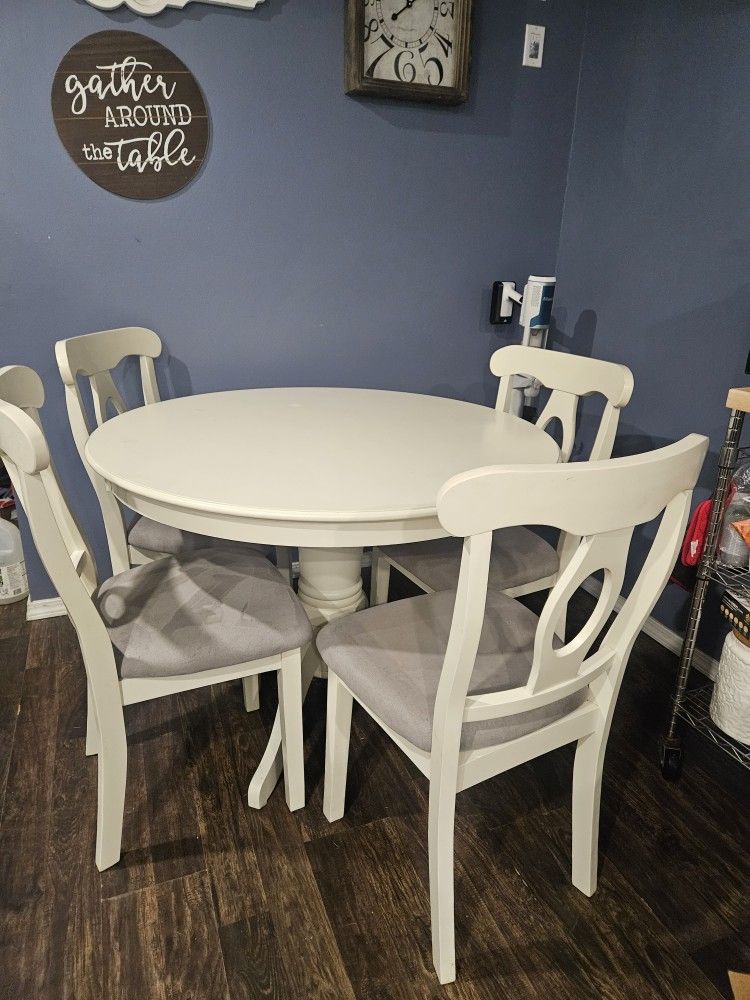 Dining set with 4 chairs Off white about 2 yrs old A few small stains on chairs of fabric nothing huge we actually had covers on table and chairs from Amazon Table Has a small bubble and spot Nothing major Asking 120.00 Pink up in Kent