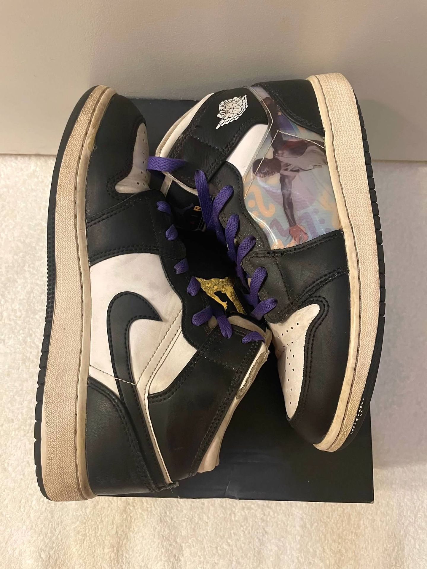 Good condition stylish Air Jordan sneakers for kids with hologram sides. Features black and white design with purple laces (also have black laces/never used).