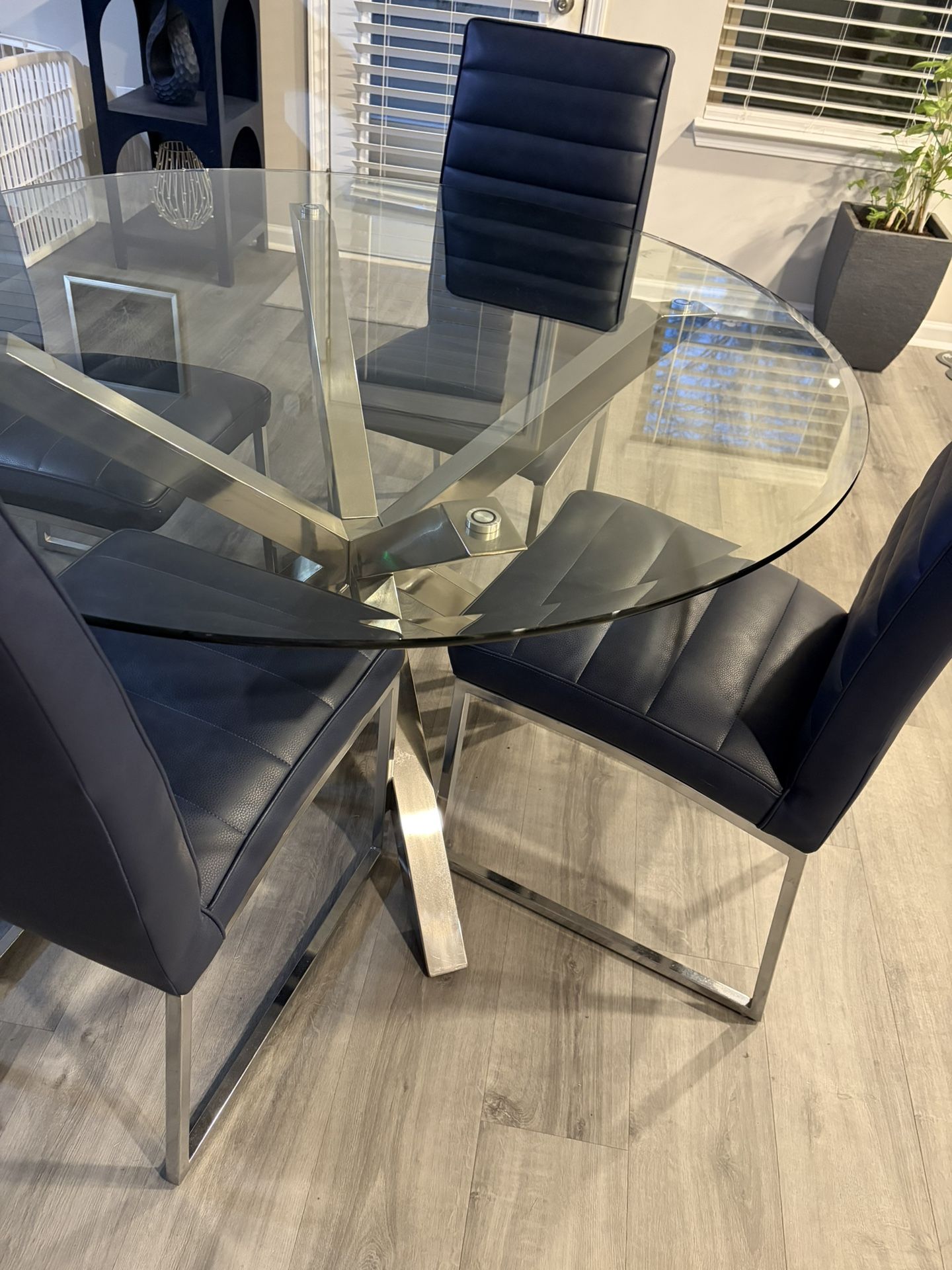 54” round glass table with chrome base. Four dark blue chairs with chrome legs. Excellent condition!