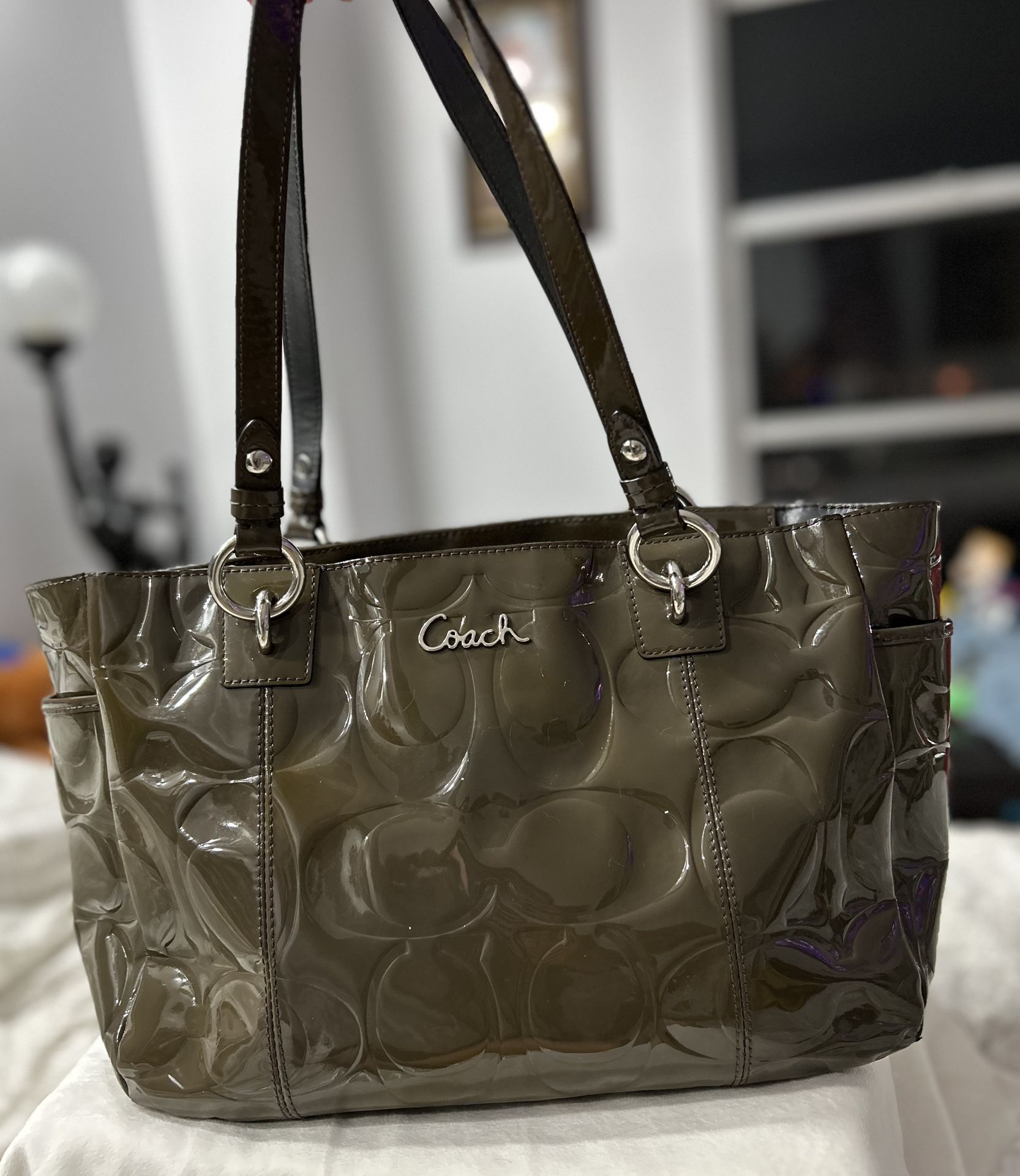 Coach Auth Olive Green Patent Leather Tote Bag Purse Double Handles Dust Bag