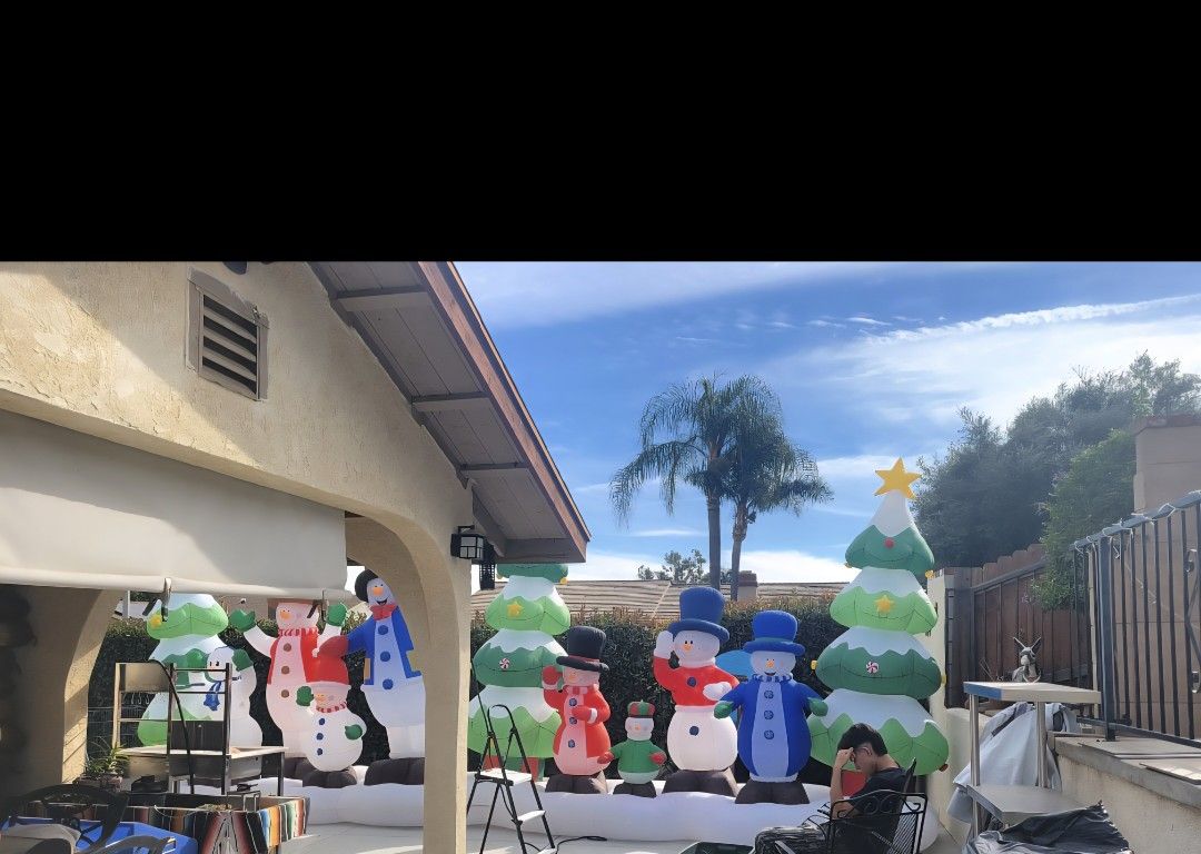 Had this for over 15 years. It measures approximately 15 feet + wide and about 10 feet high ( tree only) rest vary in sizes. It comes es with 2 blowers, working music box which you can connect the lights and will synchronize to music. Plus also have the stakes and ropes to tie down. The 3 zippers that keep air in and used to deflate are broken so you have to replace them or keep shut with strong clips. It inflates fine but needs TLC. Makes great Christmas yard decoration. One of a kind