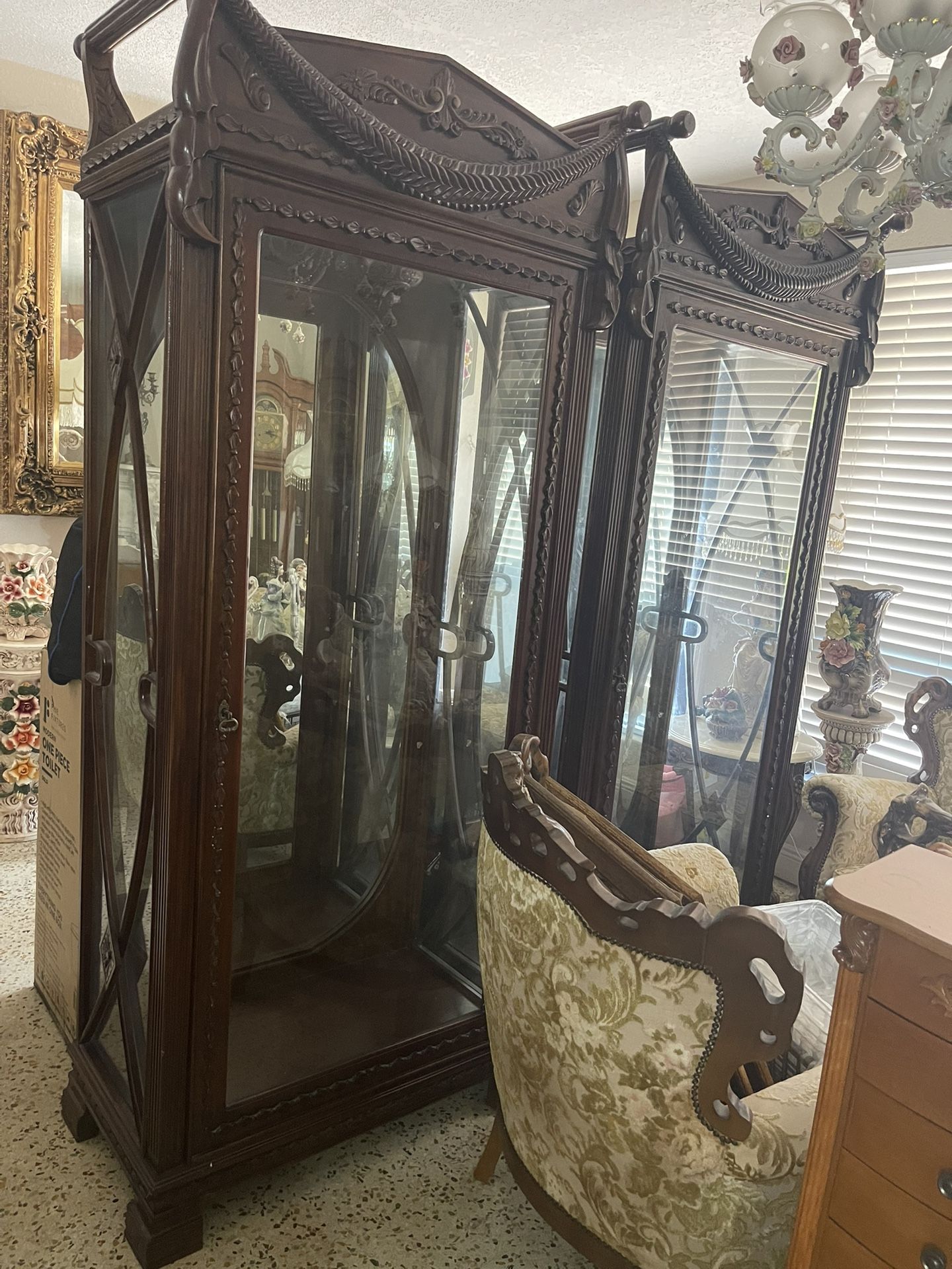 2 curios antiguos de madera macisa real , con todos sus vidrios intactos , con 4 divisiones de tamaño grande , cada uno con su llave original PRECIO 600 cada uno Son piezas ÚNICAS