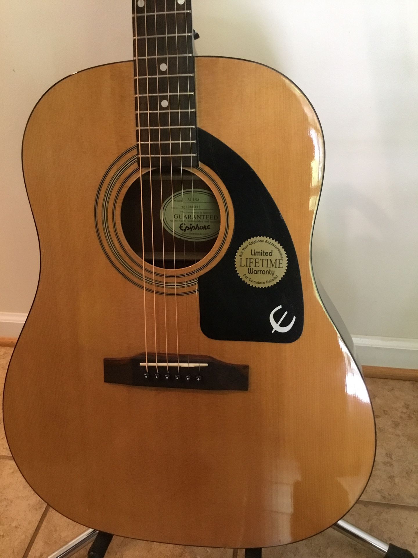 Like new acoustic guitar. It still has the plastic on the pick guard! Cleaned up and restrung with Martin #12 Flexcore. If you need loud, this is it. The select spruce top with mahogany back and sides on the Epiphone AJ-1 Acoustic Guitar generates a round, mellow, and perfectly pleasing tone. The mahogany neck with rosewood fretboard is friendly on the hand and easy to fret. Body binding, pearl fretboard inlays, chrome hardware, and a natural gloss finish unique in this price range add up to gorgeous looks. A fantastic value on a sweet guitar.