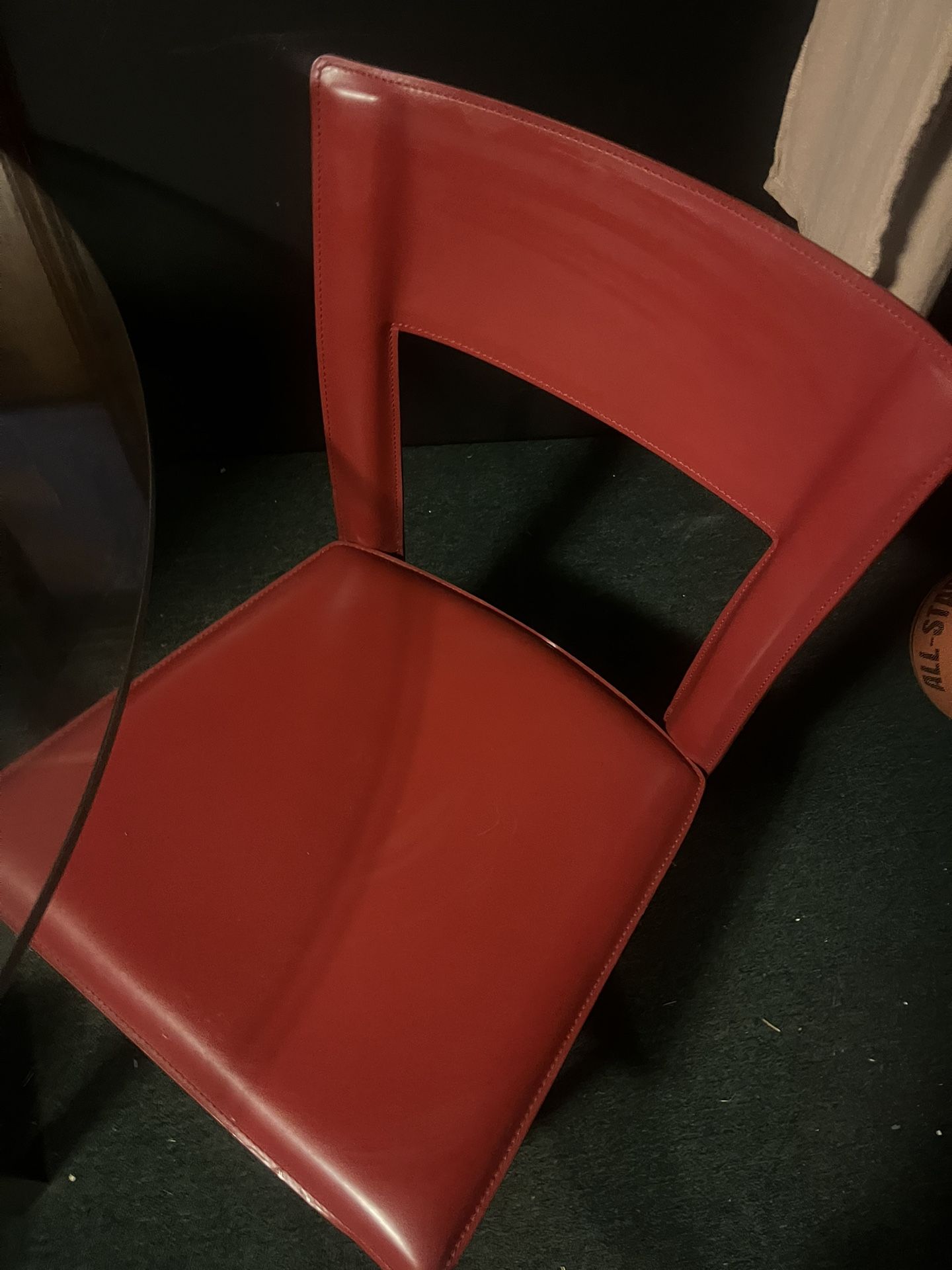 6 piece kitchenette consisting of round good lass table top, silver metal base, 4 red leather look chairs. Normal wear and tear mainly on top of 2 chairs no scratches/ discolorations
