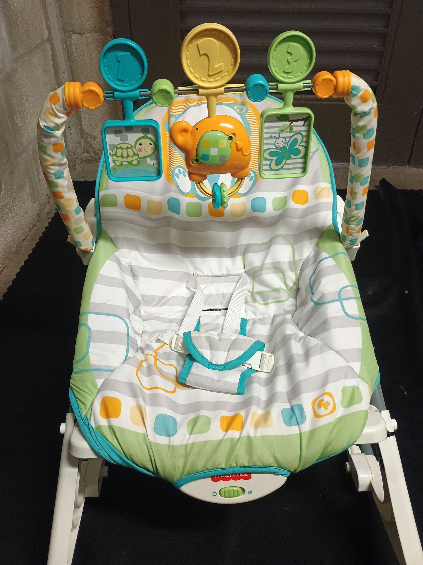Fisher Price musical, vibrating baby chair. Baby rocking chair that also vibrates plays music . Provides a safe place for babies to sit and play and also good for napping.