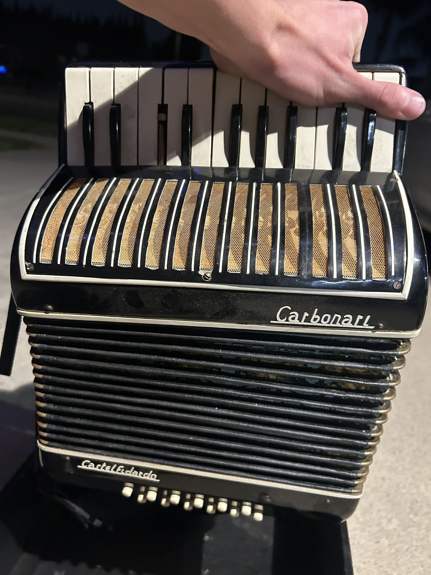 Vintage Carbonari piano accordion. The instrument is in used condition and the piano keys are not working. Physical condition shows normal wear from age and use (see photos). Good for parts, repair, restoration, or as a display/collector piece. Brand name Carbonari visible on the body.