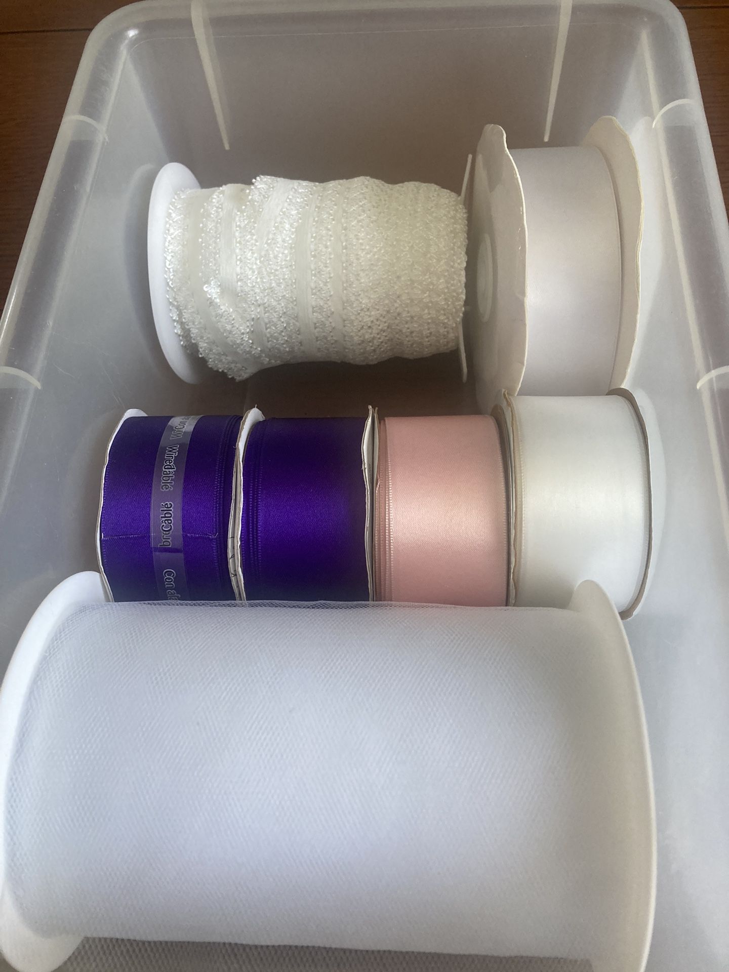 White tulle spool, white lace elastic trim, white double-sided satin white, pink wired double-side white, purple wired double-sided satin (one new spool, one partial). These have not been used. Leftover from wedding and shower (purple & pink ribbons). Great for Advent, gift wrapping, events, or Spring crafts. From pet-free and smoke-free home.