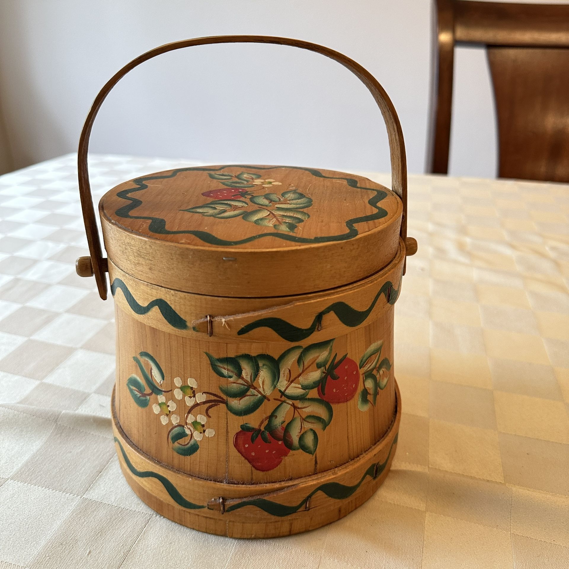 Vintage Woodencraftery Strawberries and Blossoms hand painted wooden covered firkin bucket folk art