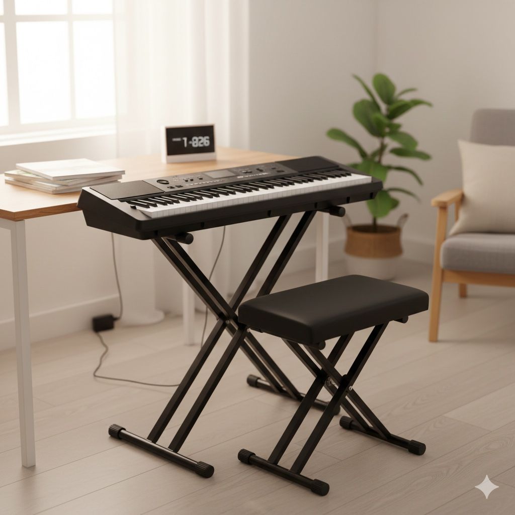 Beginner-friendly keyboard setup in great condition. Perfect for anyone starting piano lessons or looking for a compact practice station.