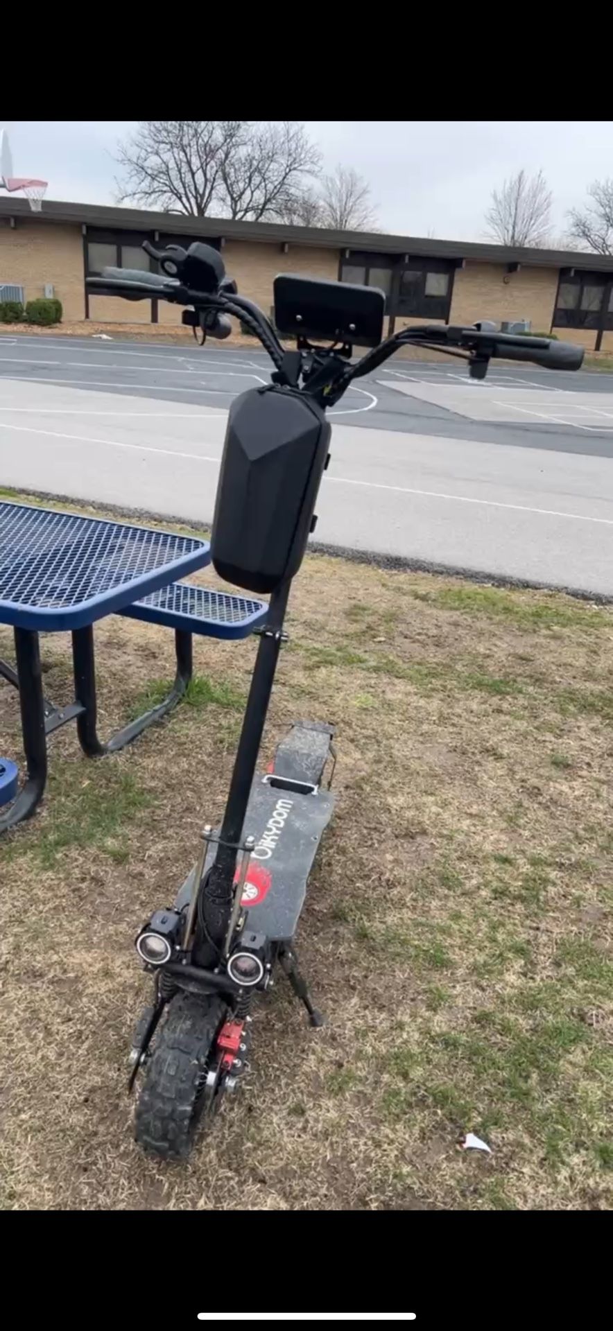 50mph easy got a key and mirrors and turn signal and horn and rgb lights everywhere the suspension are great 3 gears dual motor in front and rear wheels it’s great i bought it for 1k and the stuff the bags and mirrors and the phone holder and the lock and the mask so everything was 1250 bucks the only problem with is the back breaks you just need to get a new one for 40 bucks i just need the money that’s why i’m selling it very safe and fun