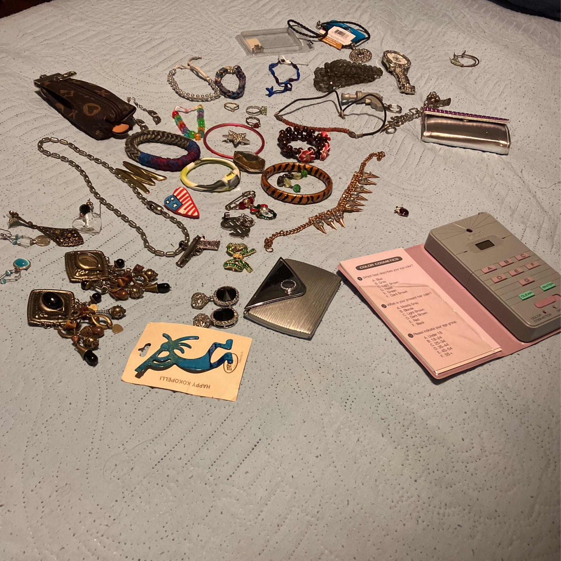 Earrings bracelets watch beads manicure set Avon mirror etc