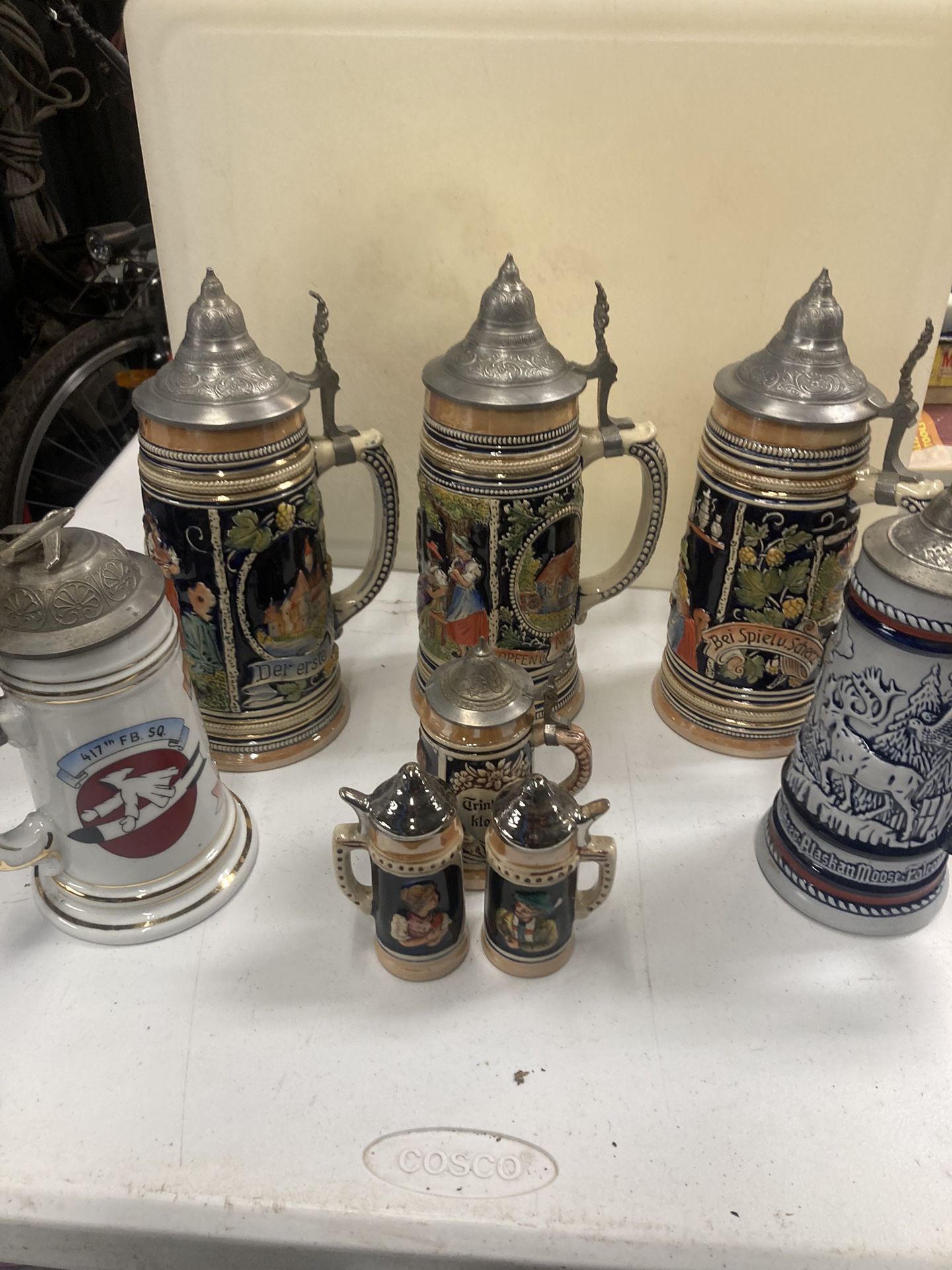 Collectables Vintage German made beer steins in great condition some are numbered on bottom one is Avon 2 are salt and pepper shakers (small ones )