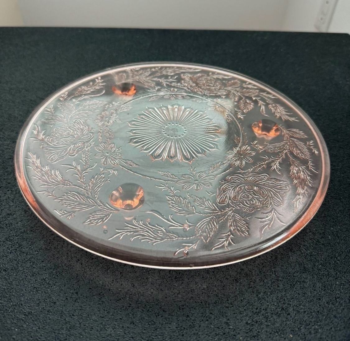 Vintage Pat Appl'd For glass Pink 'Rose' Three-Footed Cake Plate approx 10” In good condition