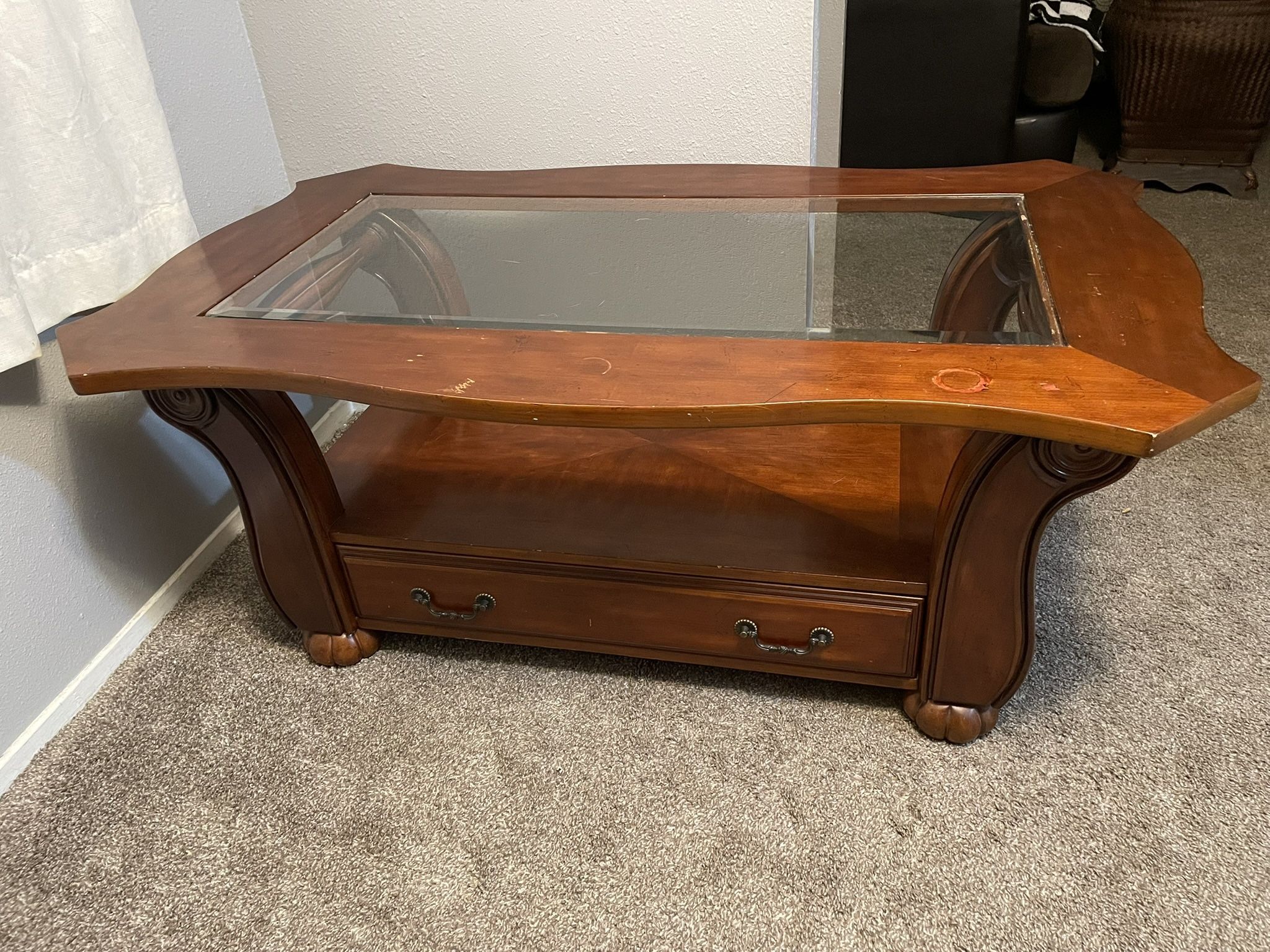 Coffee table with glass top. Nice heavy duty table. Has storage area under glass top and a drawer built in the bottom for more storage. Top of wood table has a few scuffs but can be taken off sanded and painted easily. 50” long x 30” wide x 20” tall. Asking $30/OBO