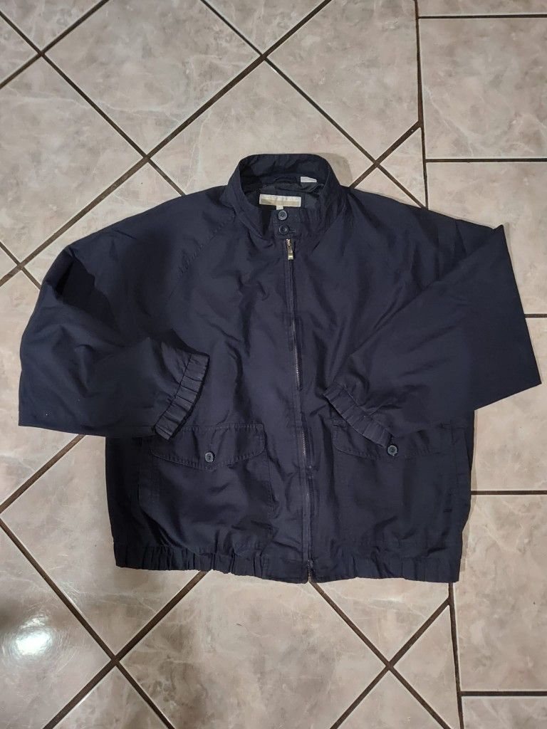 Men's navy blue jacket. Size Large. Full zip closure. Elastic cuffs and waist. Two front pockets. Good condition. text for more information or pictures