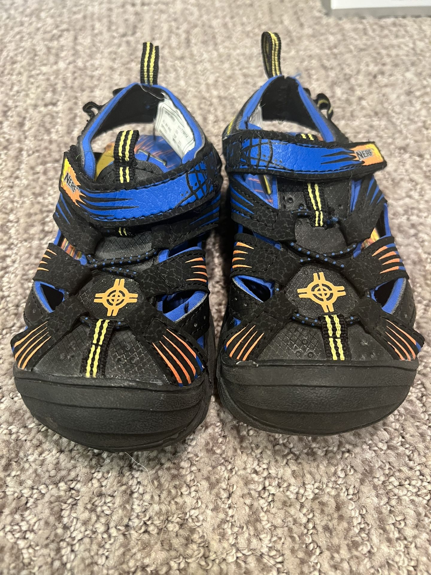 Black, blue and orange Nerf Kid's Sandals size 7c. With a hook & loop closure, they're easy to put on and take off, and the slingback style keeps them securely on his feet.