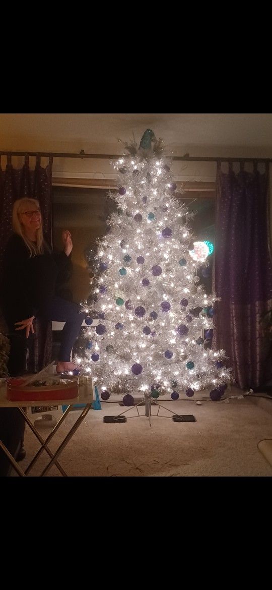 All pictures are of the same tree! No tree shines brighter than this silver tinsel tree. It absolutely glows. Great for New Year's, too! You will love it! Comes with a box of ornaments too. Pre-lit, 7', intact and in great condition. (Mannequin in pic not for sale.)