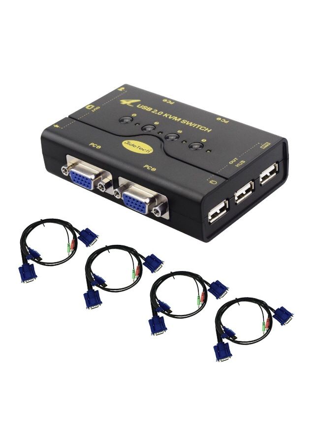 The 4-Port USB KVM Switch with Audio lets you manage 4 computers with just one set of keyboard, monitor, mouse, and a set of speakers/Microphone. The device comes with 4 sets of KVM cables, This cable KVM switch does not require a power supply as it is powered through the USB bus connection. The 4-port KVM switch also supports multiple operating systems including Windows, Sun, and Mac. no additional equipment required. Its compact size makes it ideal for home and business environment.