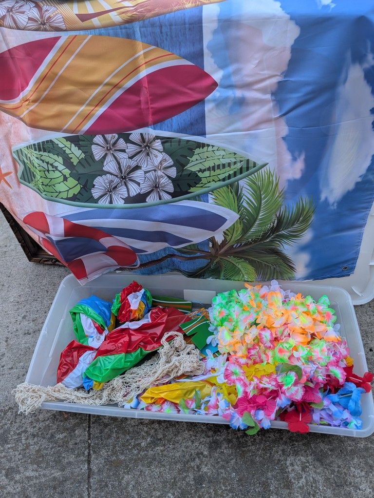 Blow up Beach balls, fish netting, banners, beach backdrop