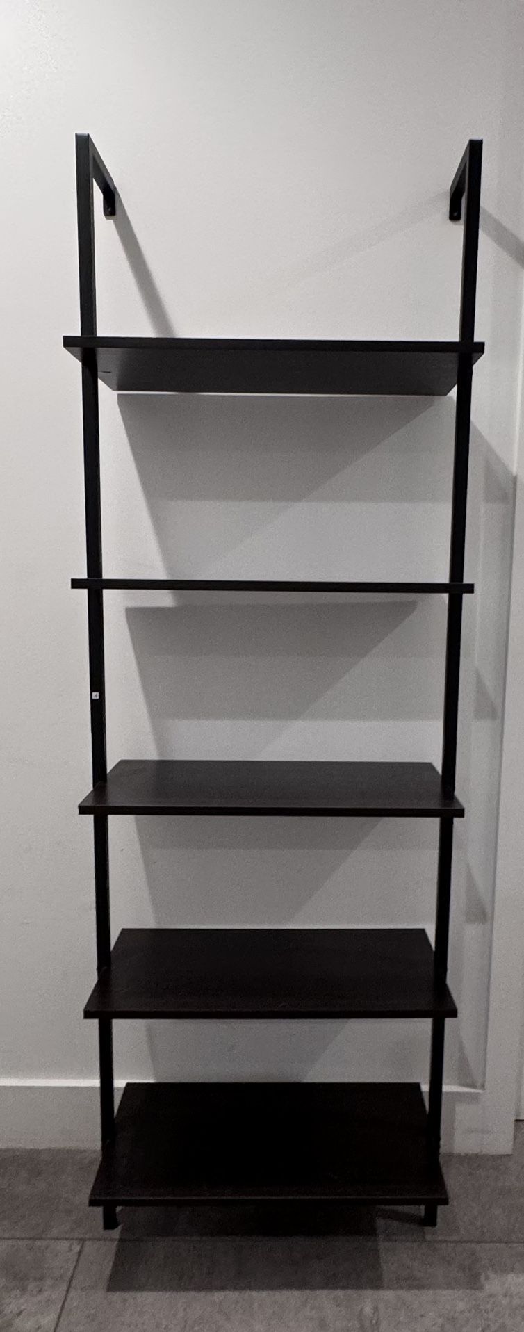 Features five open shelves supported by a breeze metal frame. Mounts to the wall and has a ladder-inspired layout. Weights & Dimensions Shelf: 23.62" W X 11.8" D X 12.48" H Overall Dimensions : 70.9" H X 23.6" W X 11.8" D Overall Product Weight: 26.5 lb.