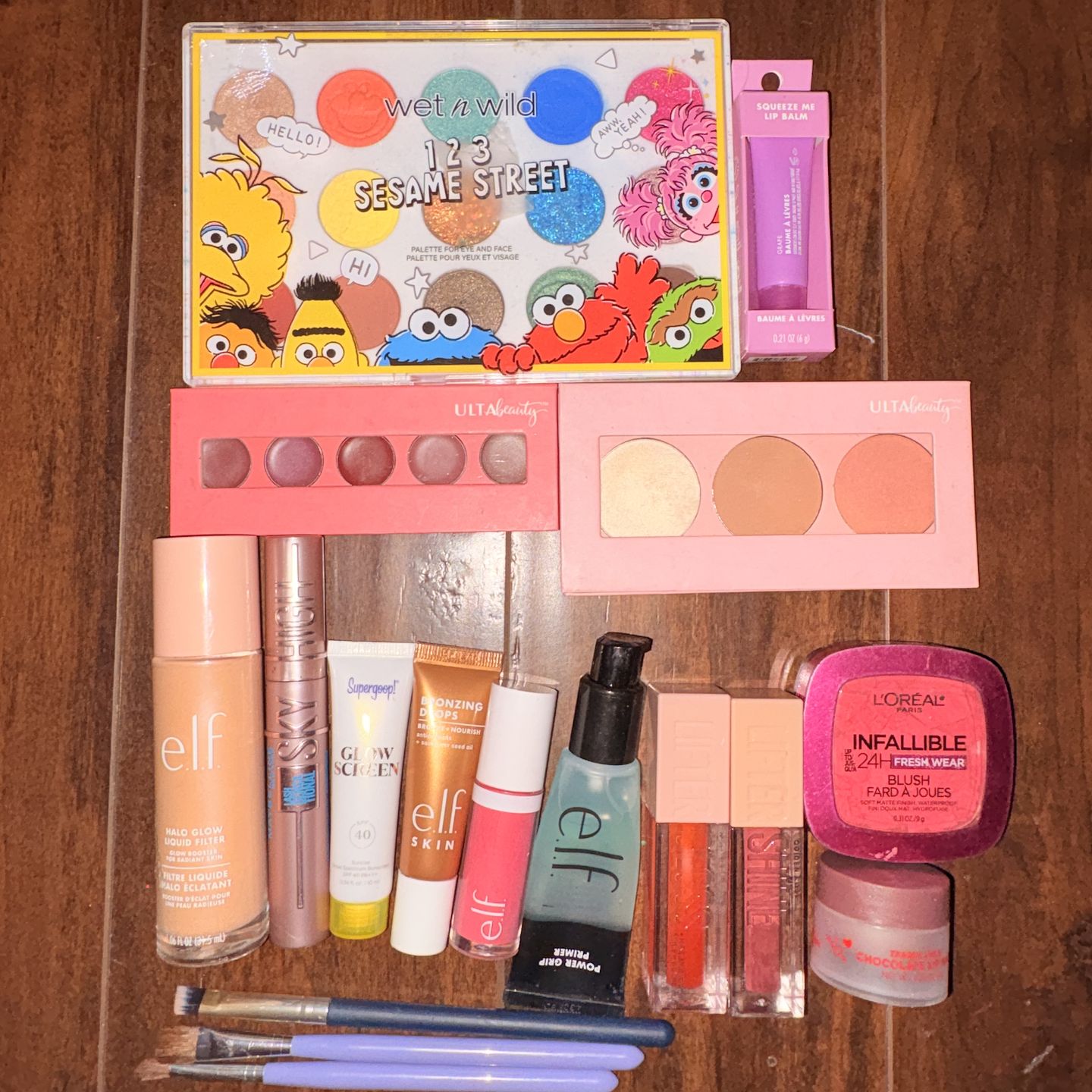 Bundle of used makeup. Some items are lightly used and some are more used. Includes e.l.f., L’Oréal, Wet n Wild, lip glosses, blush, primer, bronzing drops, eyeshadow palettes, and brushes. Everything shown in the picture is included. Selling as a bundle only. Great for beginners or practice. Flexible price Pickup only. Cash only. Priced low for quick sale.