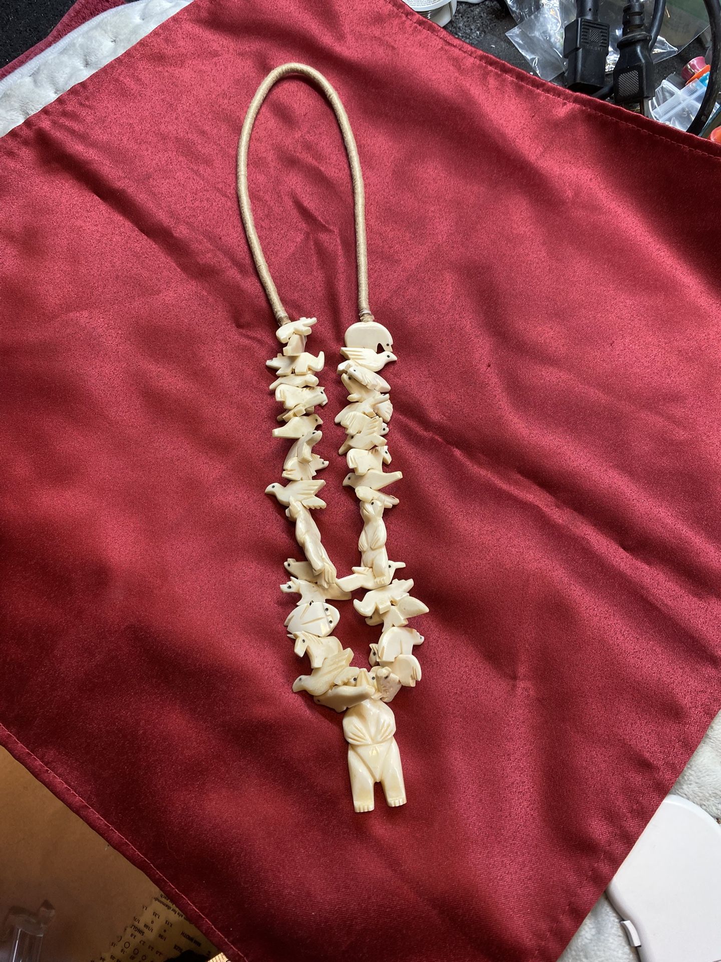 Vintage Zuni Hand-Carved Antler & Buffalo Bone Fetish Necklace – Medicine Bear & Animals Beautiful vintage handmade Zuni fetish necklace featuring hand-carved animal figures made from antler and buffalo bone. Traditional fetish animals include bear (medicine bear), fox, horse, bird, and buffalo, all finely carved and strung together. Excellent vintage condition. No chips, cracks, or breaks. All carvings and the necklace are well preserved. Authentic vintage Zuni fetish necklace Hand-carved antler & buffalo bone figures Animals include bear, fox, horse, bird, and buffalo Necklace length: approximately 28 inches (closed) No clasp (traditional continuous strand) This necklace would make a fantastic addition to any Zuni, Native American, or fetish carving collection. Pickup Only: 15th Ave & Joy Ranch Rd. Phoenix, AZ 85086