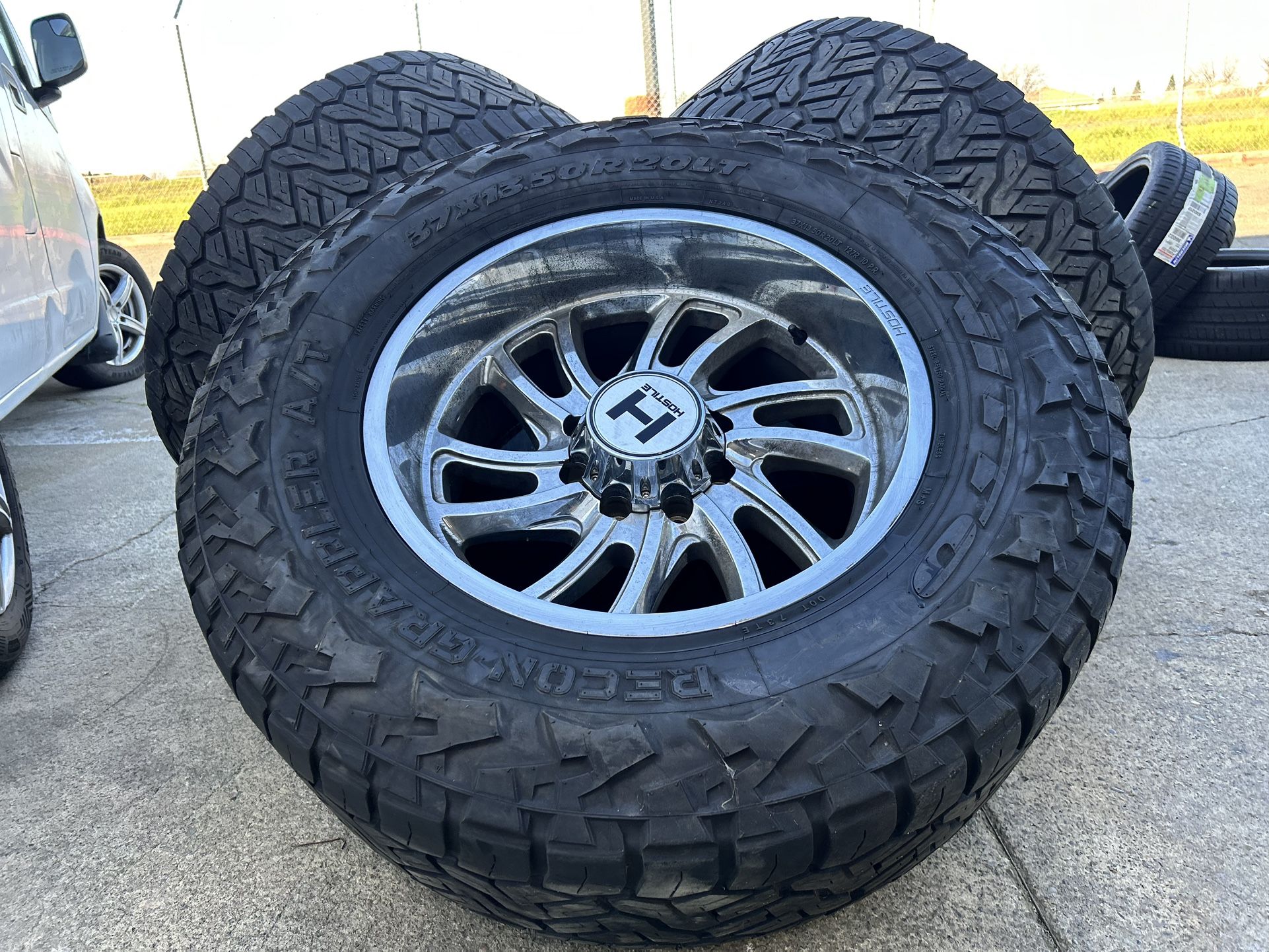 (4) 20x10 Hostile H118 Demon Armor Plated (Chrome) Wheel 8x6.5 (-19mm) Nitto 30% rims are good, no major damage minor water marks inside spoke area 8x165.1 bolt pattern no sensors 37 inch tires Nitto Recon Grappler AT 37x13.50R20LT with approx 30% tread remaining