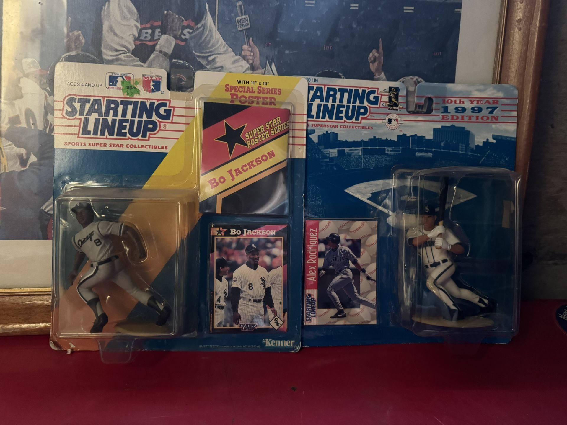 Up for grabs just in time for the Christmas season two starting lineup Baseball figures still in original packaging one Bo Jackson with Baseball card and poster from the 1992 series. And one Alex Rodriguez with Baseball card from the 1997 edition. Asking $10 for the pair . Public meeting place only 3445 N. Williams Ave. new season . Will deliver for an additional small fee. Check out my other listings of Baseball Collectibles discounts will be given for multiple purchases .