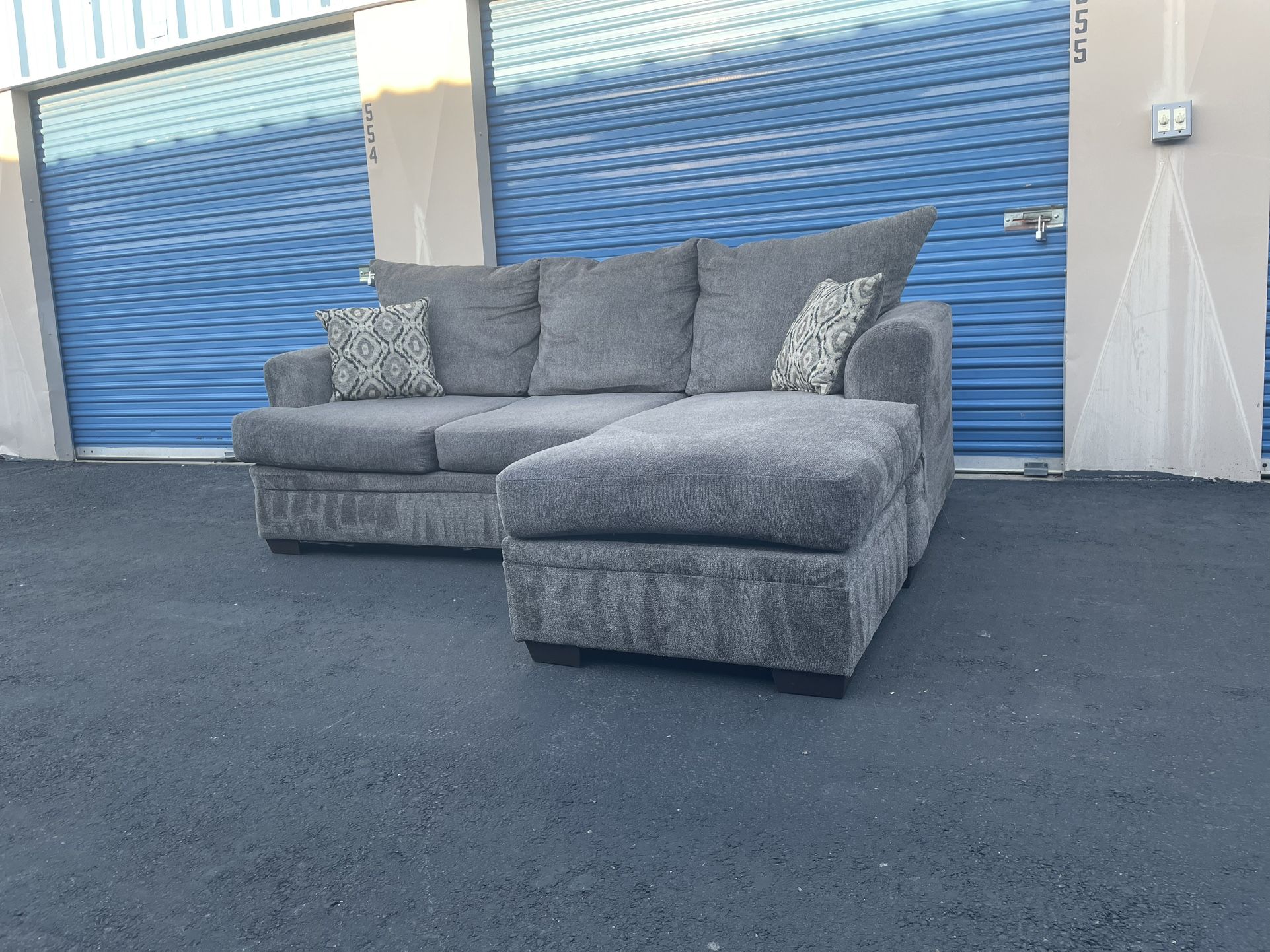 Excellent condition gray sofa chaise with reversible chaise No rips No stains Pet friendly Smoke free Odor free Just professionally cleaned Ask about delivery 89” X 64”