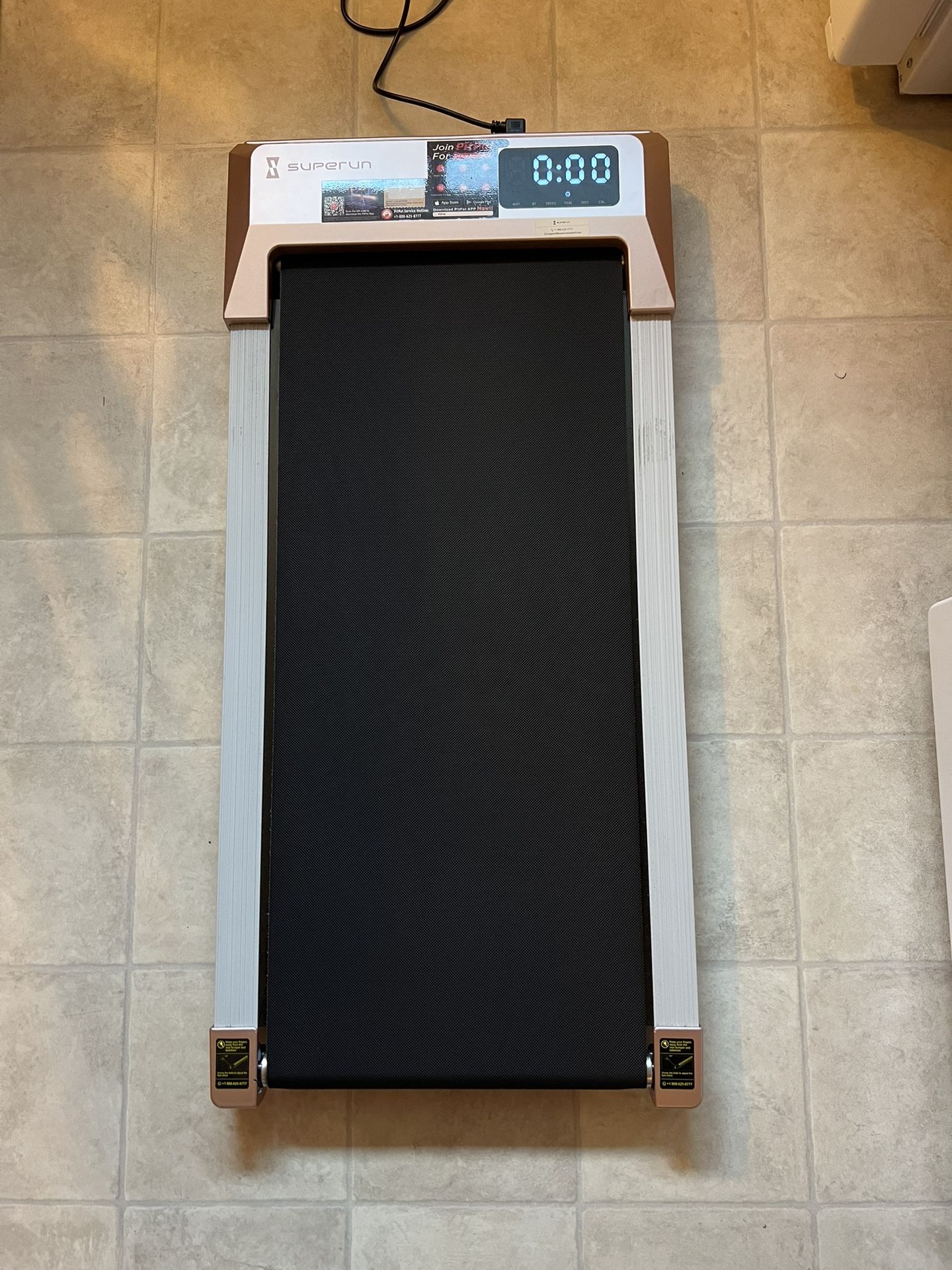Walking pad with speeds up to 3.8 mph. Includes a remote control (with an extra battery)