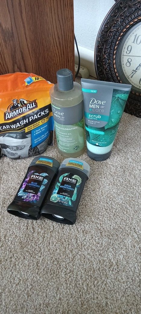 Armour All car wash pods (18 ct) 2 axe deodorant Dmc bw (26 oz) Dmc face scrub (9oz.) Retail: $40.42 Sell for $30