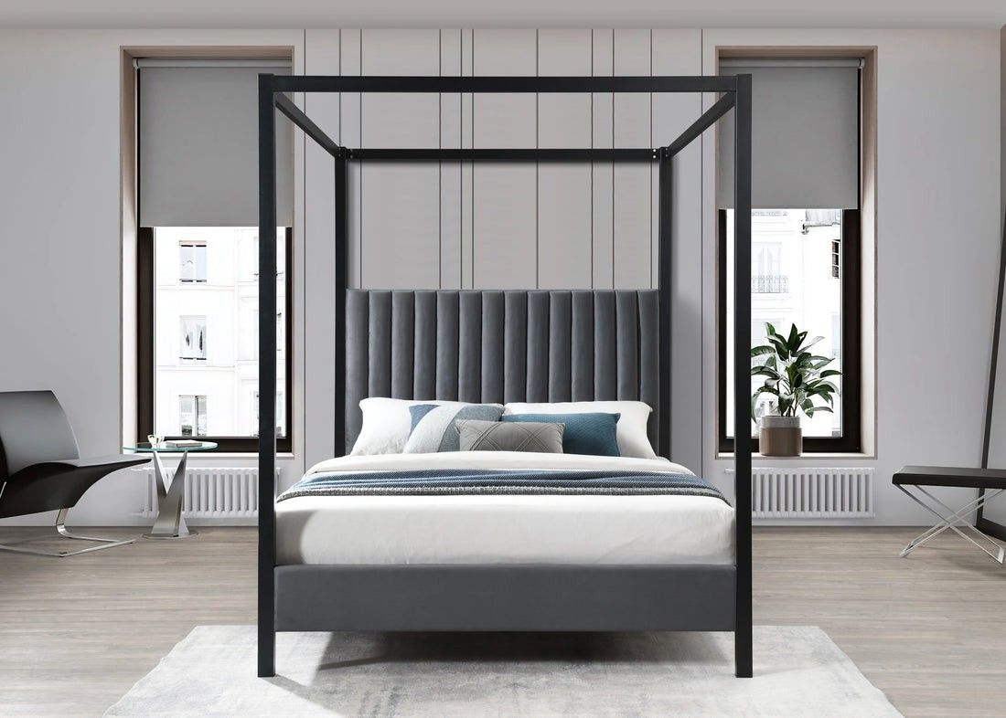 The elegant gray velvet channel tufted headboard adds a touch of luxury while the black metal canopy frame creates a modern look. Experience comfort and style with this stunning addition to your bedroom.