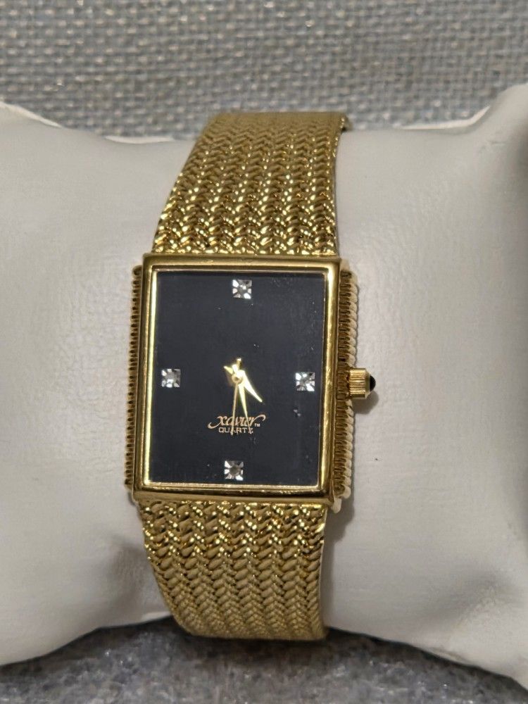 Working Vintage Xavier Tank Watch - Gold Tone - Black Dial w/ 4 Diamond Accents