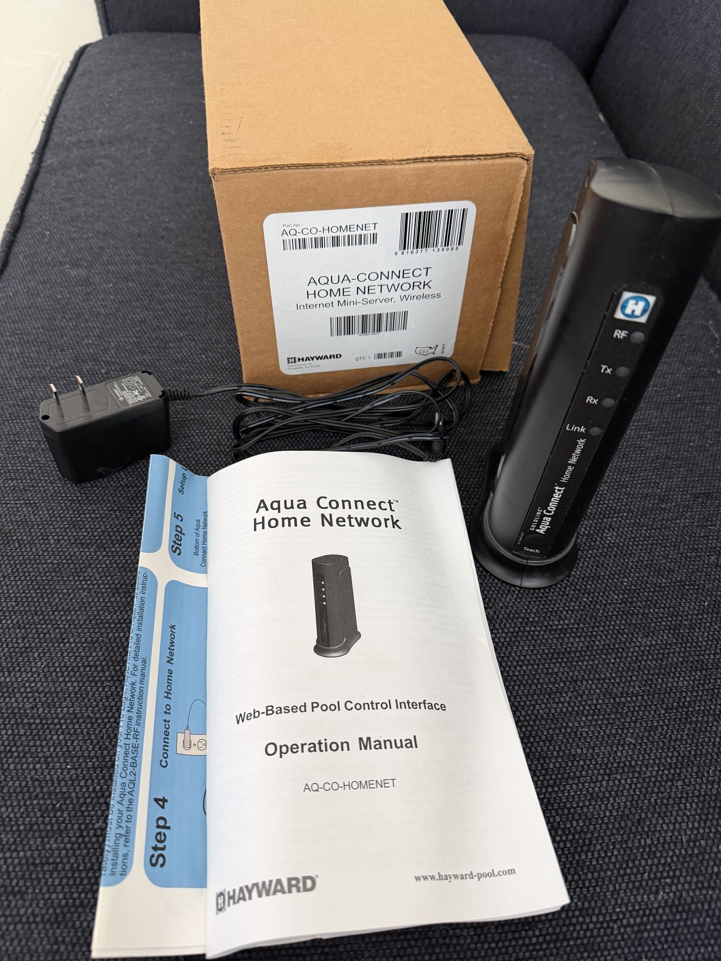 Complete Hayward Aqua Connect Home Network mini-server. Has everything you need for your pool control system. Comes with the wireless internet mini-server, power adapter, and operation manual, Features Allows control and monitoring of pool and spa functions via a home network or Wi-Fi enabled device. Provides complete water quality reporting and diagnostics. Offers automated chemical maintenance with the Sense and Dispense option. Sends automatic alerts via email or text. Enables global remote control and monitoring of multiple pools.