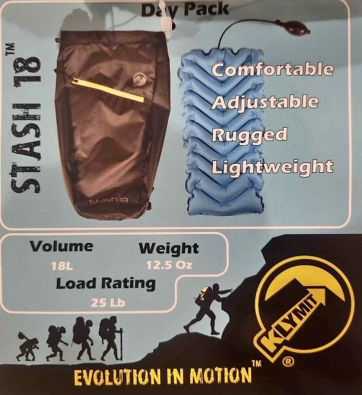 Klymit stash 18 hiking backpack Volume 18L Weight 12.5oz Loading rating 25 LB Local pick up only. If the post is up, its still available.