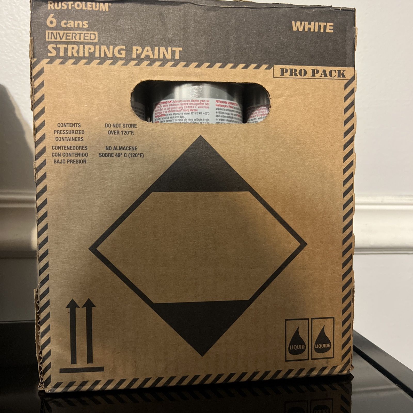 RUSTOLEUM 6 cans INVERTED STRIPING PAINT 2174 CONTENTS PRESSURIZED CONTAINERS CONTENEDORES CON CONTENIDO BAJO PRESION DO NOT STORE OVER 120°F. NO ALMACENE SOBRE 49° C (120°F) WHITE