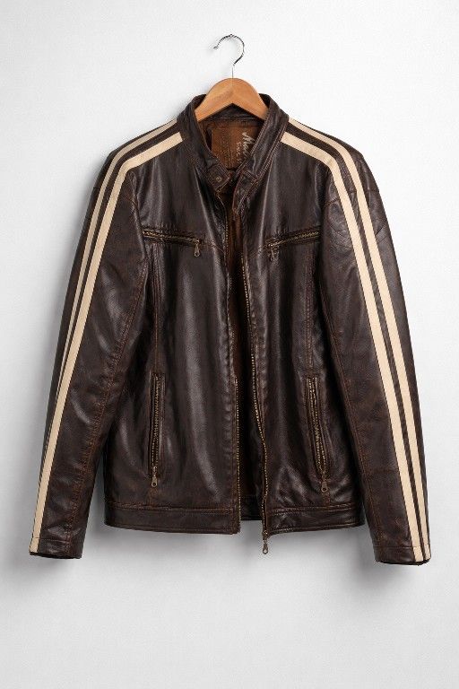 Machine Since 1998 Faux Leather Racing Jacket Elevate your casual wardrobe with this classic Machine Since 1998 racer jacket. Featuring a dark brown finish with striking cream dual stripes down the sleeves, this jacket captures a timeless "biker" aesthetic. It’s a perfect mid-weight layer for cool weather or a night out. Product Details Brand: Machine Since 1998 Style: Cafe Racer / Moto Jacket Color: Dark Brown with Cream sleeve stripes Size: XL (Extra Large) Material: 100% Polyvinyl Chloride (High-quality faux leather / PVC) Origin: Designed in USA, Made in China Key Features Sporty Accents: Iconic dual stripes on the shoulders and arms for a retro racing look. Hardware: Full-zip front with multiple functional zippered pockets (two chest, two hand). Collar: Classic snap-tab moto collar. Easy Care: Machine washable (cold) according to the care tag—much easier to maintain than real leather. Condition Overall: Great pre-owned condition. The faux leather has a nice sheen, and the hardware is fully functional. Notes: Please see photos for a close-up of the material texture and labeling.