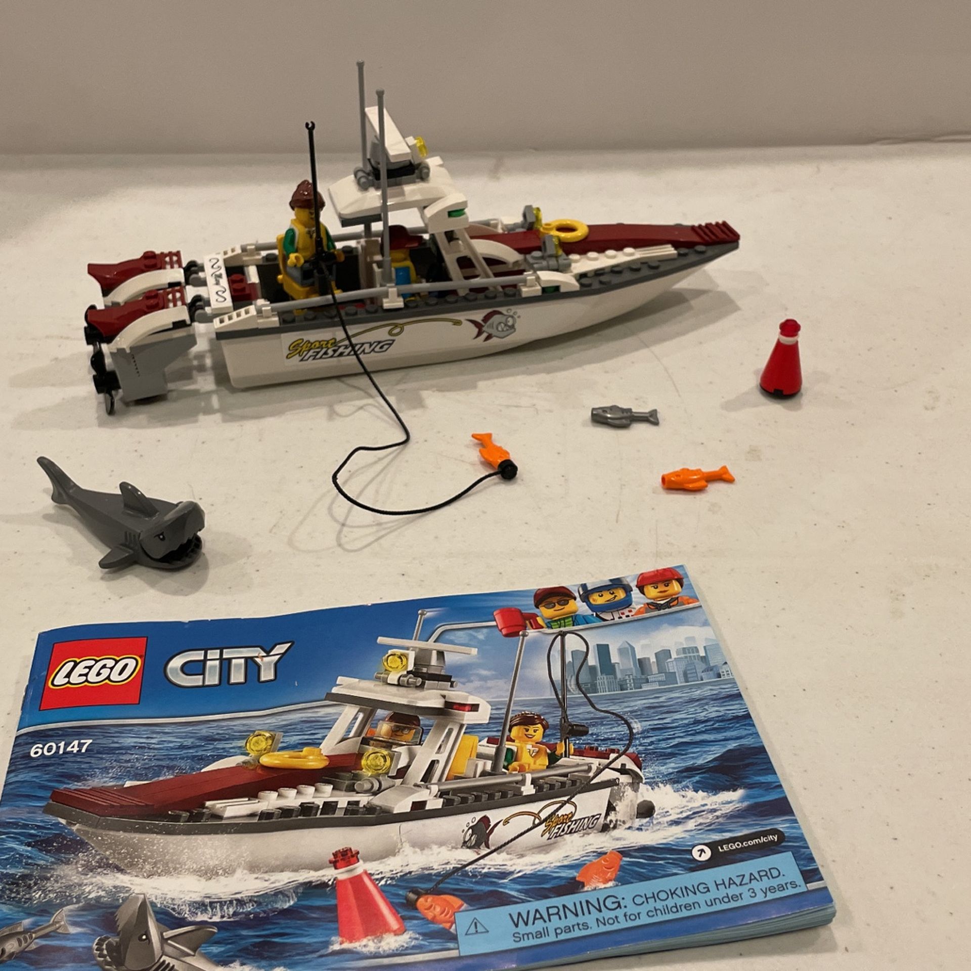 No box. No missing pieces. Includes two figures, shark, and three fish. This is a retired set. 144 pieces. Includes manual.
