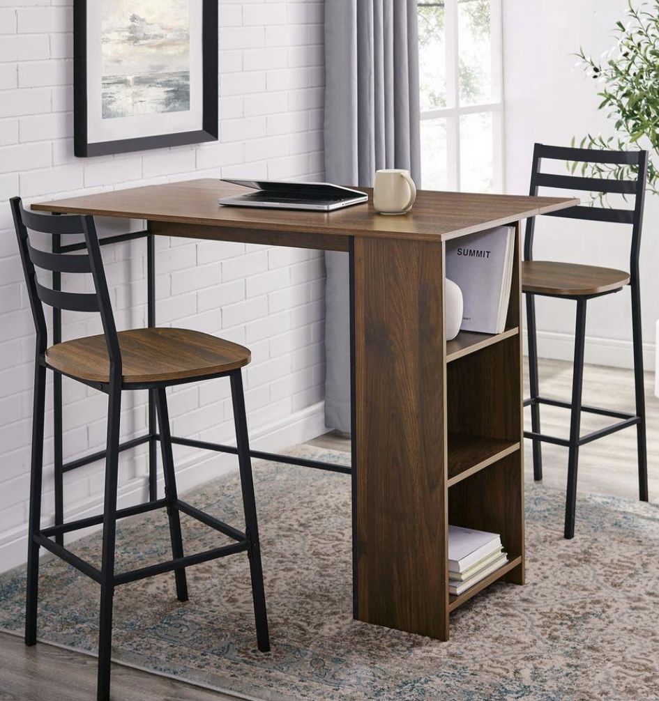 Set includes 1 table and 2 chairs. Table: 36" H x 48" L x 20-30" W - Stools: 39" H x 17.25" L x 17.75" W Condition: Like New Color: Dark Walnut