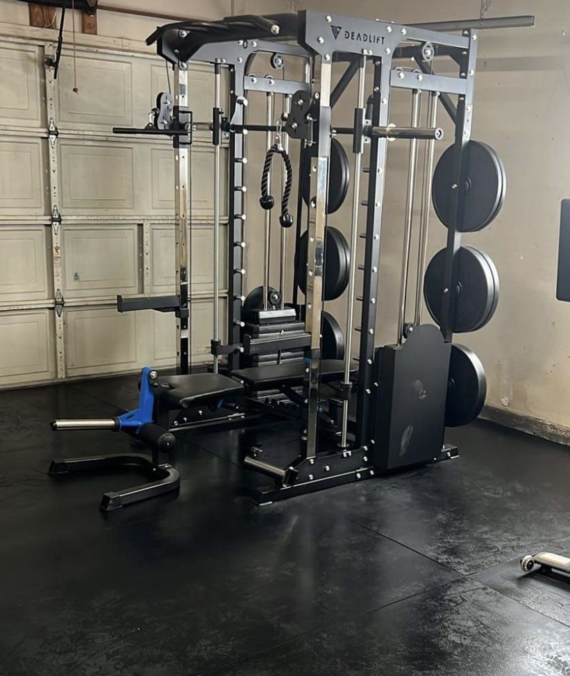 All new in unopened boxes Multifunctional trainer has 2 150lb weight stacks, land mine attachment, double cross over cables, lat pull, lower row, smith bar, and pull up tower. Comes with all attachments, fully adjustable bench, and Olympic weight set. 2100.00 firm 1600.00 for machine alone Also flooring, dumbbells, curl bars available for additional cost