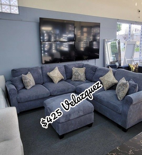 Set Includes: • Left-Arm Facing (LAF) Loveseat • Right-Arm Facing (RAF) Loveseat • Corner Wedge • Ottoman (29” x 29” x 19” H) Dimensions: • Sectional: 99” x 99” x 34” x 35” H • Ottoman: 29” x 29” x 19” H Details: • Upholstery: Dark Grey Corduroy Fabric • Rounded Arms for added comfort • Knock-Down (KD) design – assembly required • Brand new in box Price: • ✅$425 + Sales Tax = ($469 Total) • Cash Only – Firm Price Important Info: • Pick-Up Only – Delivery Not Available • Final Sale – Limited Quantity