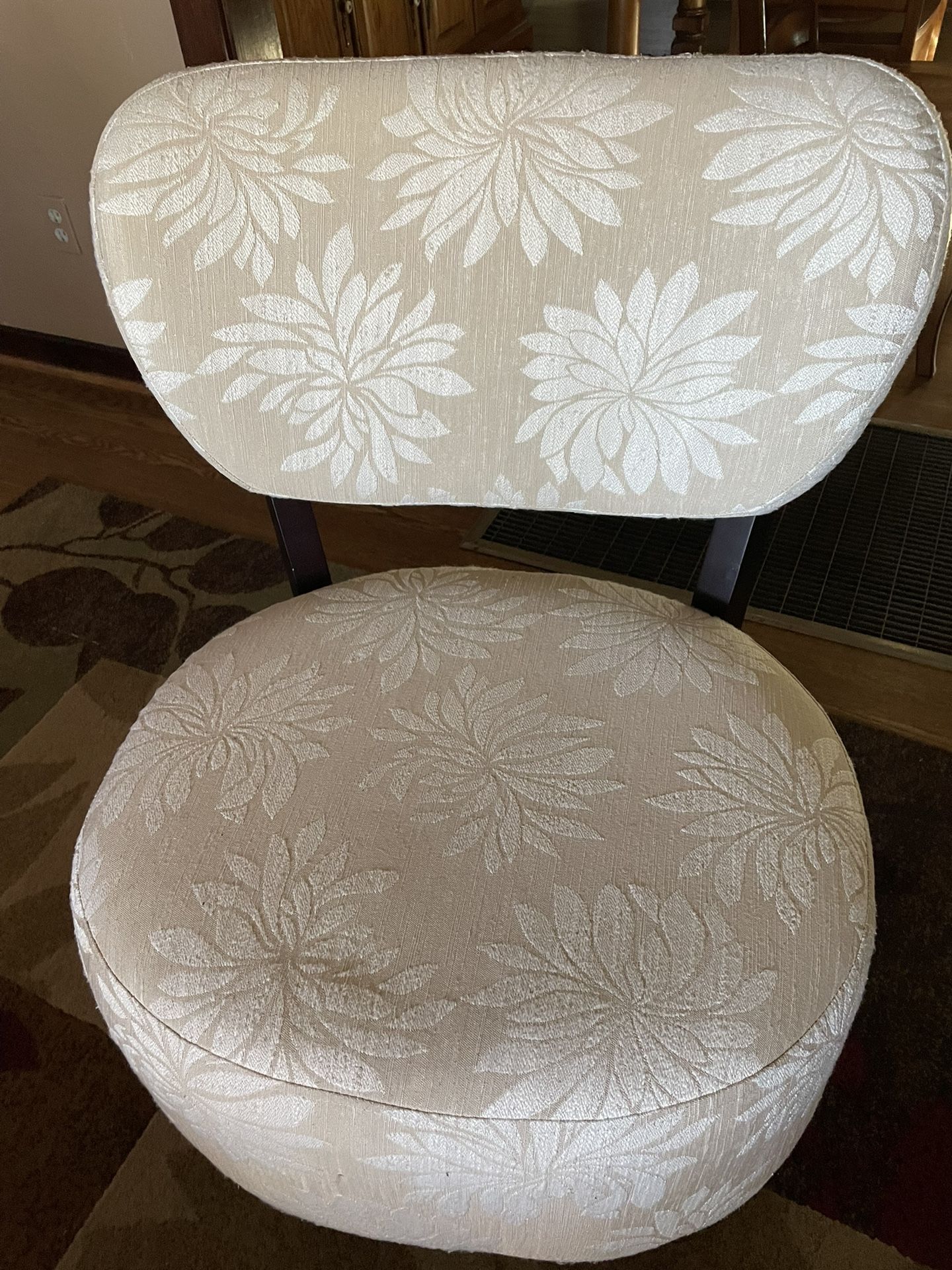 Gorgeous style indoor seating chair beige with dark wood trim. In excellent condition. Rounded seat with back support rest. Designed by Coaster - Original cost $395. Height 34” Width 25”